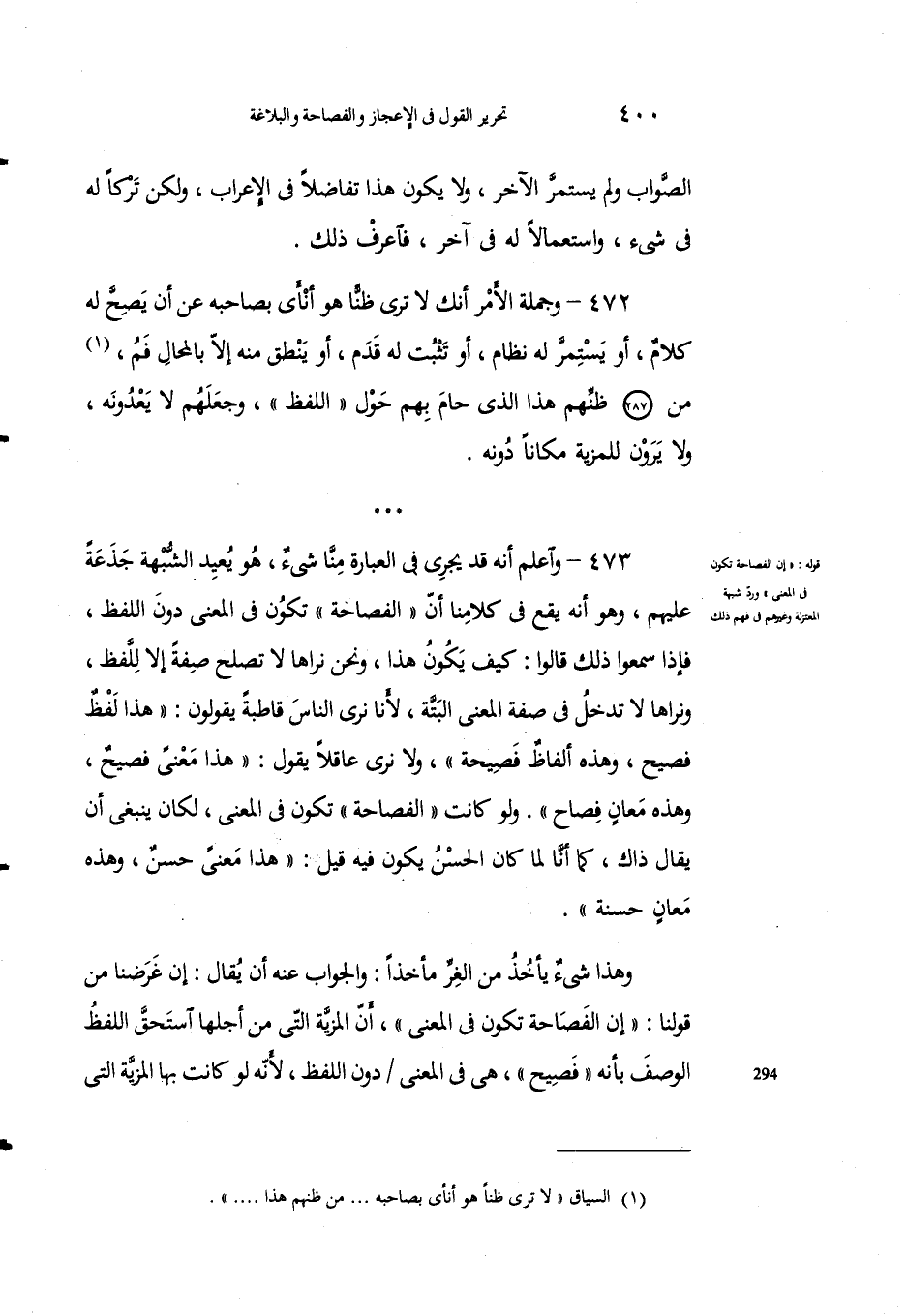 472 - وجملةُ الأمرِ أنك لا تَرى ظنَّاً هو أَنْأَى بصاحبِه عن أن يصِحَّ له كلامٌ، أو يستمِرَّ له نظامٌ، أو تَثْبُتَ له قدَمٌ، أو يَنْطِقَ منه إلاَّ بالمُحال فمٌ1، مِنْ ظَنِّهم هذا الذي حامَ بهم حَوْلَ "اللفظِ"، وجعلهم لا يعدونه، ولا يرون للمزية مكانًا دونه.