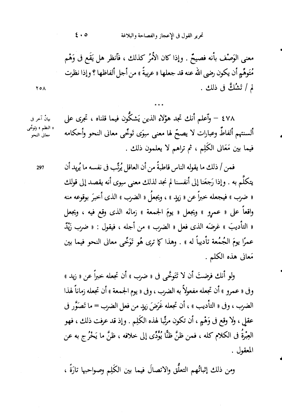 ولو أنك فرضْتَ أنْ لا تتوخَّى في "ضرَب" أن تَجْعَلَه خبراً عن "زيدٍ" وفي "عمرو" أن تجعله مفعولاً به الضرب، وفي "يومِ الجمعة" أن تَجْعله زماناً لهذا الضرْب، وفي "التأديبِ"، أنْ تَجعله غَرَض زيدٍ من فعلٍ الضرب ما تصوِّرَ في عقلٍ، ولا وَقَع في وَهْم، أن تكونَ مرتِّباً لهذه الكَلِم، وإذْ قد عرفْتَ ذلك، فهو العِبْرةُ في الكلام كلِّه، فمَنْ ظَنَّ ظناً يؤدِّي إِلى خِلافِه، ظَنَّ ما يخرُج به عن المعقول.