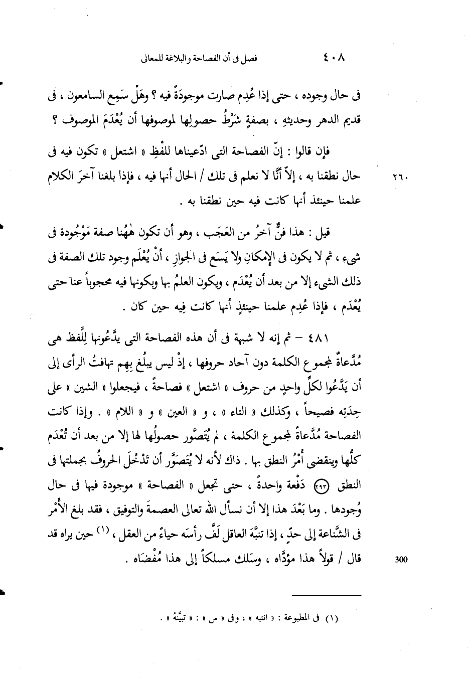 481 - ثم إِنه لا شُبْهةَ في أنَّ هذه الفصاحةَ التي يَدَّعونها لِلَّفْظِ هي مُدَّعاةٌ لمجموعِ الكلمةِ دون آحادِ حروفِها، إذْ ليس يَبْلغُ بهم تهافُتُ الرأي إِلى أَن يَدَّعوا لِكلِّ واحدٍ من حروفِ "اشتعلَ" فَصَاحةً، فَيَجْعَلُوا "الشِّين" على حِدَتهِ فَصيحاً، وكذلك "التاء" و "العين" و "اللام". وإِذا كانتِ الفصاحةُ مدَّعاةً لِمَجموعِ الكلمةِ، لم يُتصوَّرْ حصولُها لها إلاَّ من بعْدِ أن تعدم كلها وينقضي أمر النطق بها. ذاك لأنه لا يُتصوَّر أن تدخُلَ الحروفُ بجملتها في النطقِ دفعةً واحدةً، حتى تُجعلَ "الفصاحةُ" موجودةً فيها في حالِ وجودها. وما بعْد هذا إلاَّ أن نسألَ اللهَ تَعالى العصمةَ والتوفيق، فقد بلغَ الأمرُ في الشناعةِ إِلى حد، إذ تنبه العاقلُ لَفَّ رأسَهُ حياءً من العقلِ1، حين يراه قد قال قولًا هذا مؤداه، وسك مسلكًا إلى هذا مفضاه.