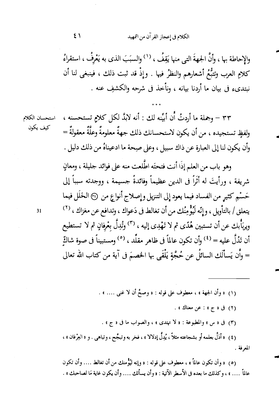 33 - وجملةُ ما أردتُ أن أبينَه لك: أنَّه لا بدَّ لكلَّ كلامٍ تستحسنُه، ولفظٍ تستجيدهُ، من أن يكونَ لاستحسانِك ذلك جهةٌ معلومةٌ وعلَّةٌ معقولةٌ وأن يكونَ لنا إِلى العبارةِ عن ذاك سبيلٌ، وعلى صحةِ ما أدِّعيناه من ذلك دليلٌ.