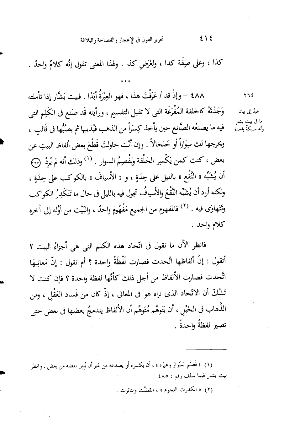 488 - وأإذا قد عرَفْتَ هذا، فهو العِبْرَةُ أبداً. فبيتُ بشار إِذا تأَملْتَه وجدْتَهُ كالحَلْقةِ المفْرَغَةِ التي لا تَقْبَلُ التقسيمَ، ورأيتَه قد صنعَ في الكَلِم التي فيه ما يَصْنَعُه الصانعُ حين يأخُذُ كِسَراً من الذَّهب فيُذِيبُها ثمَّ يَصبُّها في قالبٍ، ويُخرِجُها لكَ سِواراً أو خلْخالاً. وإنْ أنتَ حاوَلْتَ قَطْعَ بعضِ ألفاظِ البيتِ من بعضٍ، كنْتَ كمَنْ يَكْسِرُ الحَلْقة ويَفْصِمُ السِّوارَ1. وذلك أنه لم يُرِدْ أن يُشَبِّهَ "النقْعَ" بالليل على حدة، و "الأسياف" بالكَواكِب عَلى حدَة، ولكنهُ أرادَ أن يُشَبِّه النقْعَ والأسيافُ تَجُولُ فيه بالليل في حالِ ما تَنْكَدِرُ الكواكِبُ وتتهاوى فيه2. فالمفهومُ من الجميع مفهومٌ واحد، والبيتُ مِن أوله إِلى آخرِه كلامٌ واحدٌ.