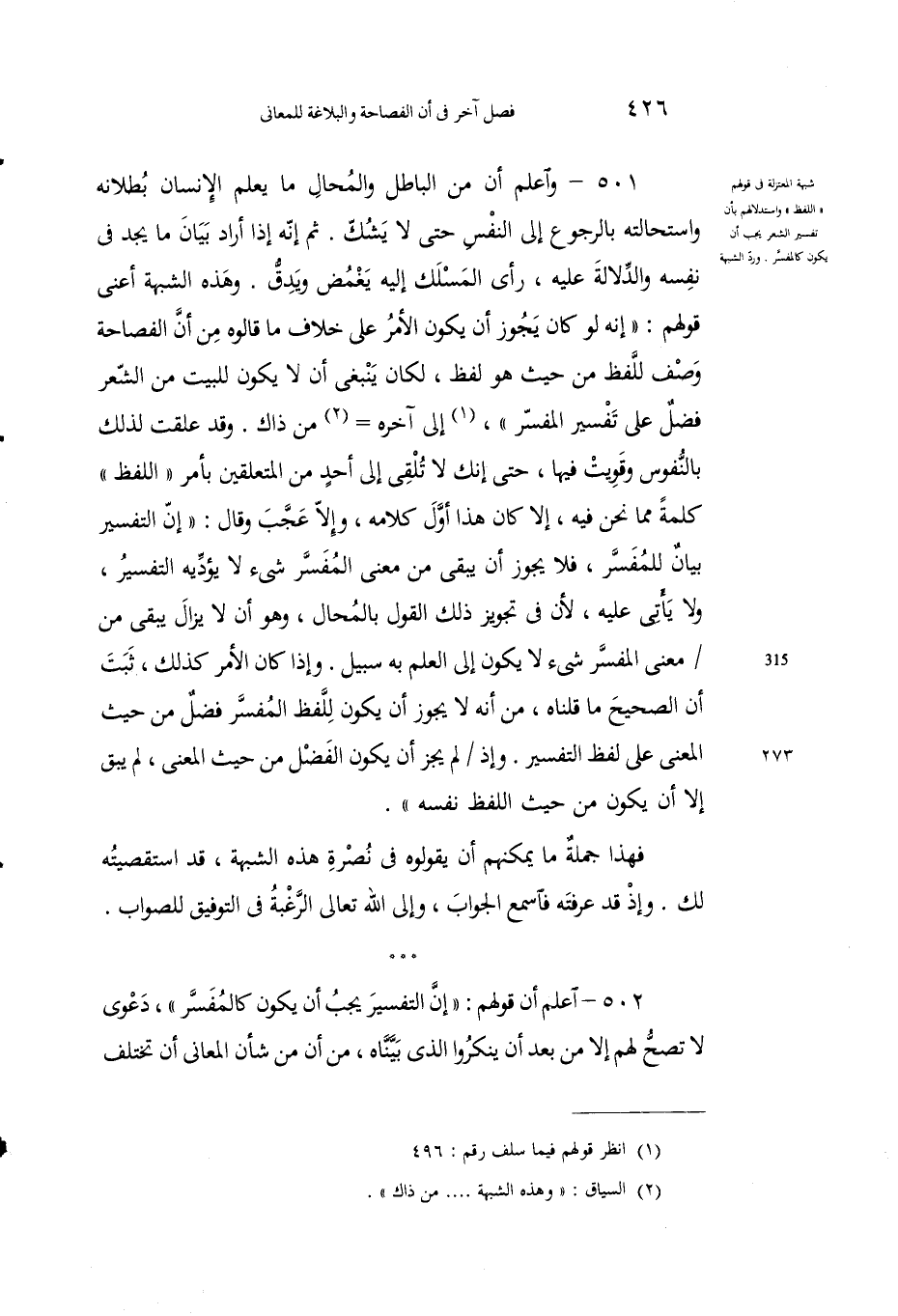 502 - إعلمْ أنَّ قولَهم: "إنَّ التفسيرَ يجبُ أنْ يكونَ كالمفسَّر"، دعوى لا تَصِحُّ لَهم إلاَّ مِن بعْدِ أنْ يُنْكِروا الذي بيَّناه، مِنْ أنَّ مِن شأْن المعاني أن تختلف.