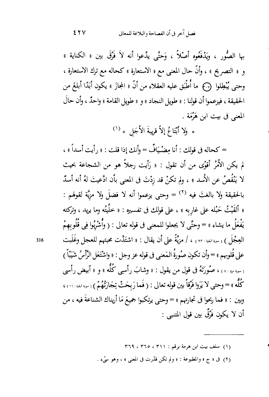 كحالهِ في قولك: أنا مضيافٌ وأَنَّك إِذا قلتَ: "رأيتُ أسداً"، لم يكنِ الأمرُ أقوى من أَنْ تقولَ: "رأيتُ رجلاً هو مِنَ الشجاعةِ بحيثُ لا ينقصُ عن الأَسد"، ولم تكنْ قد زدتَ في المعنى بأنِ ادَّعيتَ له أنَّه أسَدٌ بالحقيقة ولا بالغْت فيه2 وحتَّى يَزْعمُوا أنه لا فضلَ ولا مزيةَ لقولهم: "أَلقيتُ حَبْلَه على غارِبِه"، على قولك في تفسيره: "خلَّيتُهُ وما يريدُ، وتركْتُه يفَعلُ ما يشاءُ" وحتَّى لا يَجعلوا لِلمعنى في قوله تعالى: {وَأُشْرِبُوا فِي قُلُوبِهِمُ الْعِجْلَ} [البقرة: 93]، مزيةً على أن يقال: "اشتدَّتْ محبتُهم للعجْلِ وغلَبَتْ على قلوبهم"، وأن تكونَ صورةُ المعنى في قولِه عزَّ وجل: {وَاشْتَعَلَ الرَّأْسُ شَيْبًا} [مريم: 4]، صورتَه في قولِ من يقولُ: "وشابَ رأسي كله" و "أبيض رأْسي كلُّه" وحتى لا يَرَوْا فرْقاً بين قولِه تعالى: {فَمَا رَبِحَتْ تِجَارَتُهُمْ} [البقرة: 16]، وبينَ: "فما رَبِحوا في تجارَتِهم" وحتى يَرْتكبوا جميعَ ما أرَيْناك الشَّناعةَ فيه، من أنْ لا يكون فرق بين قول المتنبي: