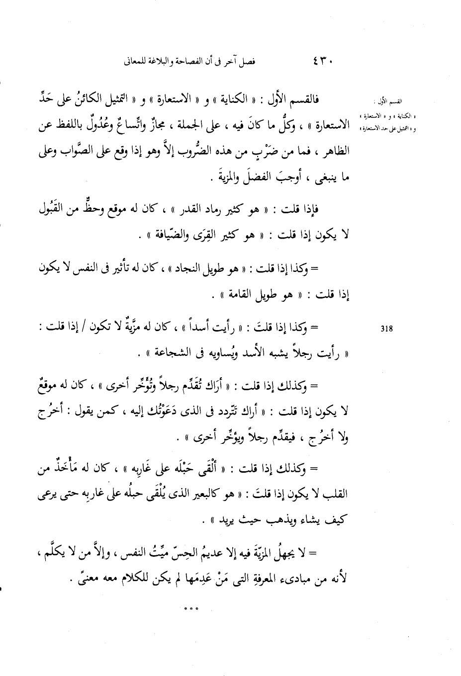فالقسم الأول: "الكناية" و "الاستعارة" و "التمثيل الكائن على حَدِّ الاستعارة"، وكلُّ ما كان فيه، على الجملةِ، مَجازٌ واتساعٌ وعُدُولٌ باللفظ عن الظاهر، فما مِنْ ضَرْبٍ من هذه الضُّروب إلاَّ وهو إِذا وقَعَ على الصواب وعلى ما يَنْبغي، أوْجَبَ الفضْلَ والمزيَّةَ.