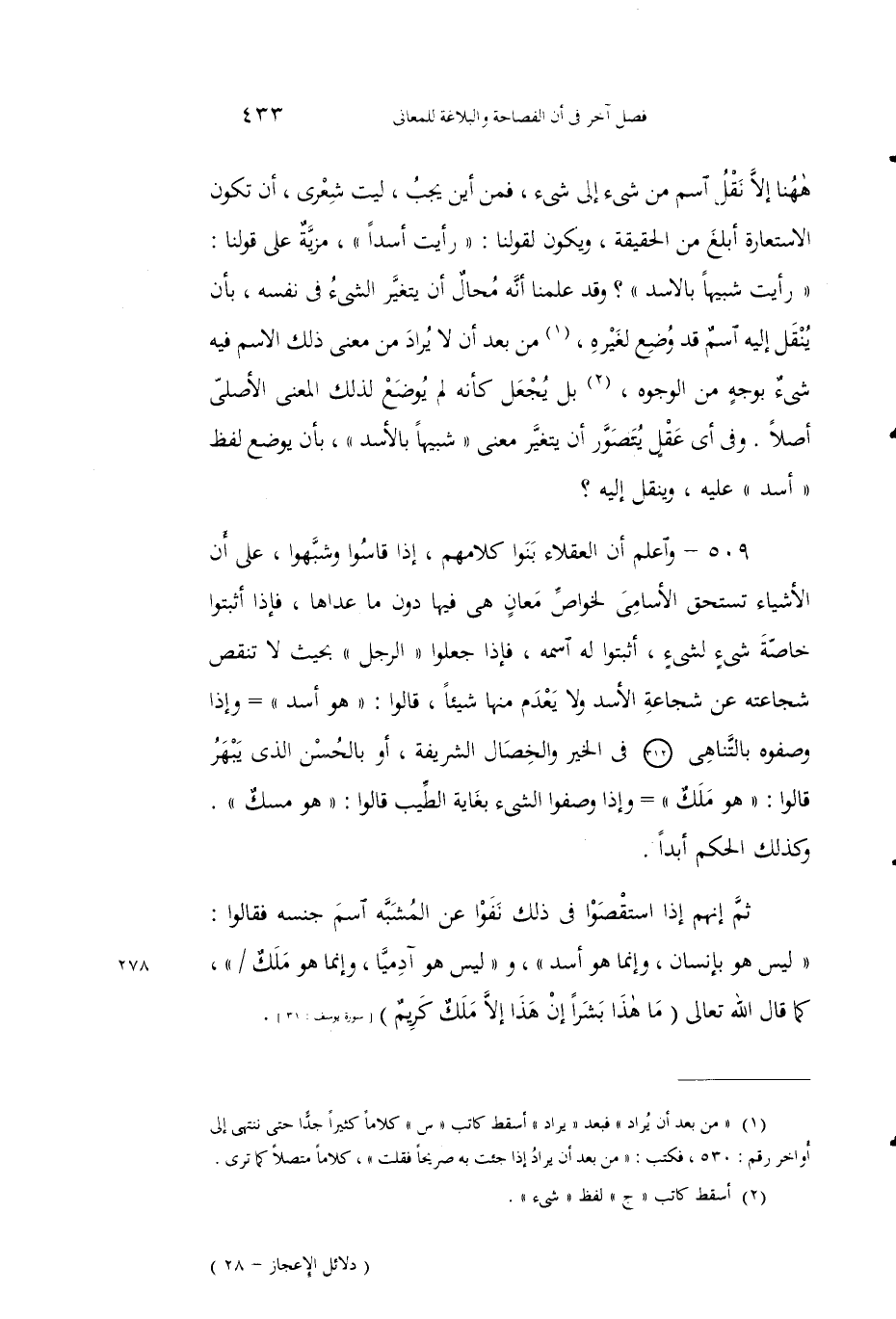 ههنا إِلا نقْلُ اسْم من شيءٍ إِلى شيءٍ، فمِنْ أينَ يَجبُ، ليتَ شعري، أَن تكونَ الاستعارةُ أبلغَ من الحقيقة، ويكونَ لِقَوْلنا: "رأيتُ أَسداً"، مزيةٌ على قولنا: "رأيتُ شبيهاً بالأسد"؟ وقد علمنا أنه محال أن يتغر الشيء في نسه، بأن يُنْقَل إِليه اسْمٌ قد وُضِع لِغيره1، من بَعْد أنْ لا يُرادَ مِن معنى ذلك الاسْم فيه شيءٌ بوجْهٍ من الوجوهِ2، بل يُجعلَ كأنه لم يُوضَعْ لذلك المعنى الأصليِّ أصْلاً. وفي أيِّ عَقْلٍ يُتَصوَّر أَنْ يتغيرَ معنى "شبيهاً بالأسد"، بأنْ يُوضَع لفظُ "أسدٍ" عليه، ويُنْقَلَ إِليه؟
