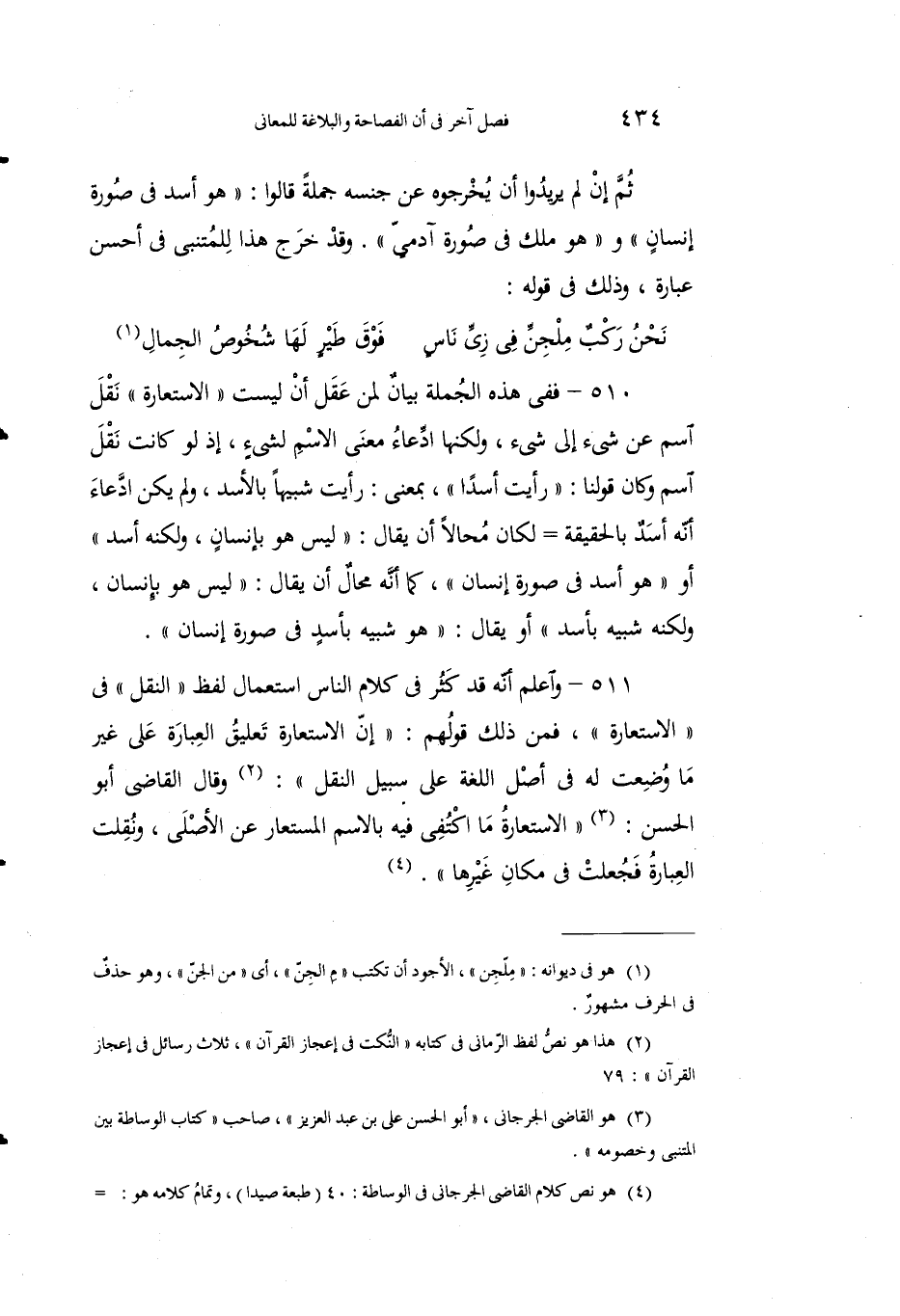 510 - ففي هذه الجملة بيانٌ لمن عَقَل أنْ ليستِ "الاستعارةُ" نْقْلَ اسْم عن شيءٍ إِلى شيءٍ، ولكنَّها ادِّعاءُ معنى الاسْمِ لشيءٍ، إِذ لو كانتْ نَقْلَ اسْمٍ وكان قولُنا: "رأيتُ أسداً"، بمعنى: رأيتُ شبيهاً بالأسد، ولم يكن ادِّعاءَ أَنه أسدٌ بالحقيقة لكانَ مُحالاً أنْ يُقال: "ليس هو بإنسانٍ، ولكنَّه أسدٌ" أو "هو أسدٌ في صورةِ إِنسان"، كما أنه محالٌ أن يقالَ: "ليس هو بإنسانٍ، ولكنَّه شبيهٌ بأَسد" أو يقالَ: "هو شَبيهٌ بأسَدٍ في صورة إِنسان".
