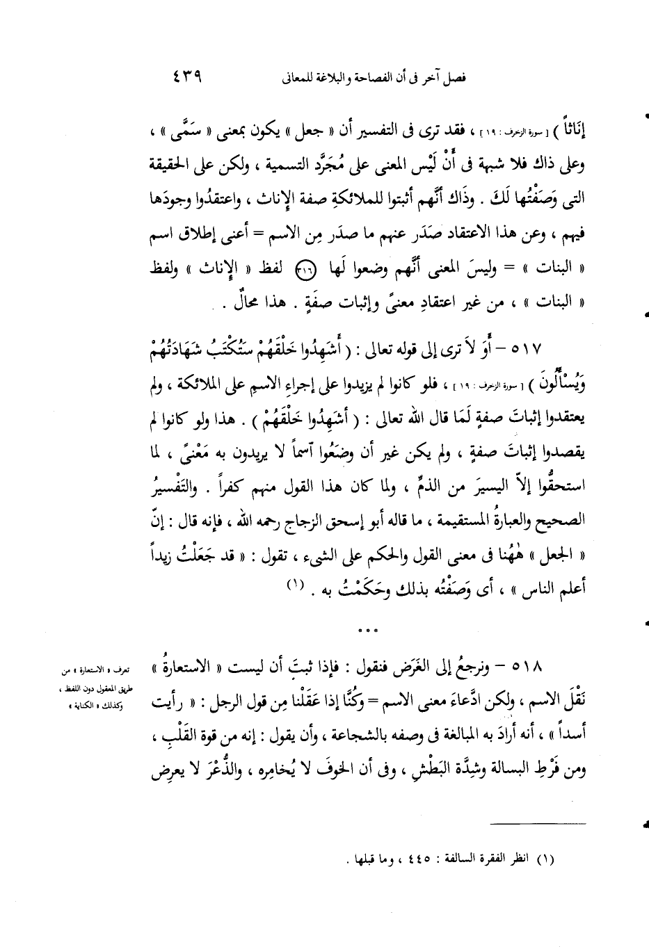 517 - أوَ لا تَرى إلى قولهِ تعالى: {أَشَهِدُوا خَلْقَهُمْ سَتُكْتَبُ شَهَادَتُهُمْ وَيُسْأَلون} [الزخرف: 19]، فلو كانوا لم يَزيدوا على إجراءِ الاسْمِ على الملائكة، ولم يَعتِقدوا إثباتَ صفةٍ لما قال الله تعالى: {أَشَهِدُوا خَلْقَهُمْ}. هذا ولو كانوا لم يَقْصِدوا إثباتَ صفةٍ، ولم يكنْ غيرَ أن وَضَعوا اسْماً لا يُريدونَ به معنىً، لَمَا استحقُّوا إلاَّ اليسيرَ من الذَّم، ولما كان هذا القولُ منهم كُفْراً. والتفسيرُ الصحيحُ والعبارةُ المستقيمةُ، ما قاله أبو إسحاقٍ الزجَّاج رحِمَه الله، فإِنه قال: إن "الجعلَ" ههنا في معغنى القَوْلِ والحُكْمِ على الشيء، تقول: "قد جَعَلْتُ زيداً أعلمَ الناسِ"، أي وصفْتَه بذلك وحكمْتَ به1.