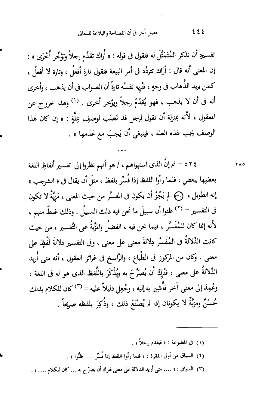 524 - ثم إنَّ الذي استهواهُم، هو أنهم نظَروا إلى تفسيرِ ألفاظِ اللغة بعضِها ببعض، فلما رأَوْا اللفظَ إذا فُسِّرَ بلفظٍ، مثْلِ أنْ يقالَ في "الشَّرجب" إنه الطويلُ، لم يَجُزْ أن يكونَ في المفسَّر من حيثُ المعنى، مزيةٌ لا تكونُ في التفسير2 ظَنَّوا أنَّ سبيلَ ما نحن فيه ذلكَ السبيلُ، وذلك غَلَطٌ منهم، لأنه إنما كان للمفسَّر، فيما نحن فيه، الفضلُ والمزيَّةُ على التفسير، من حيث كانت الدلالةُ في المفسَّر دلالةَ معنى على معنى، وفي التفسير دلالة لفظٍ على معنى. وكان من المركوزِ في الطباعِ، والراسخِ في غرائِزِ العقولِ، أنه متى أُريد الدلالةُ على معْنى، فتُرك أنْ يُصرَّحَ به ويُذْكَر باللفظ الذي هو له في اللغة، وعُمد إلى معنى آخر فأُشير به إليه، وجُعل دَليلاً عليه3 كان للكلام بذلك حسْنٌ ومزيَّة لا يكونان إذا لم يُصنَع ذلك، وذكر بلفظه صريحًا.