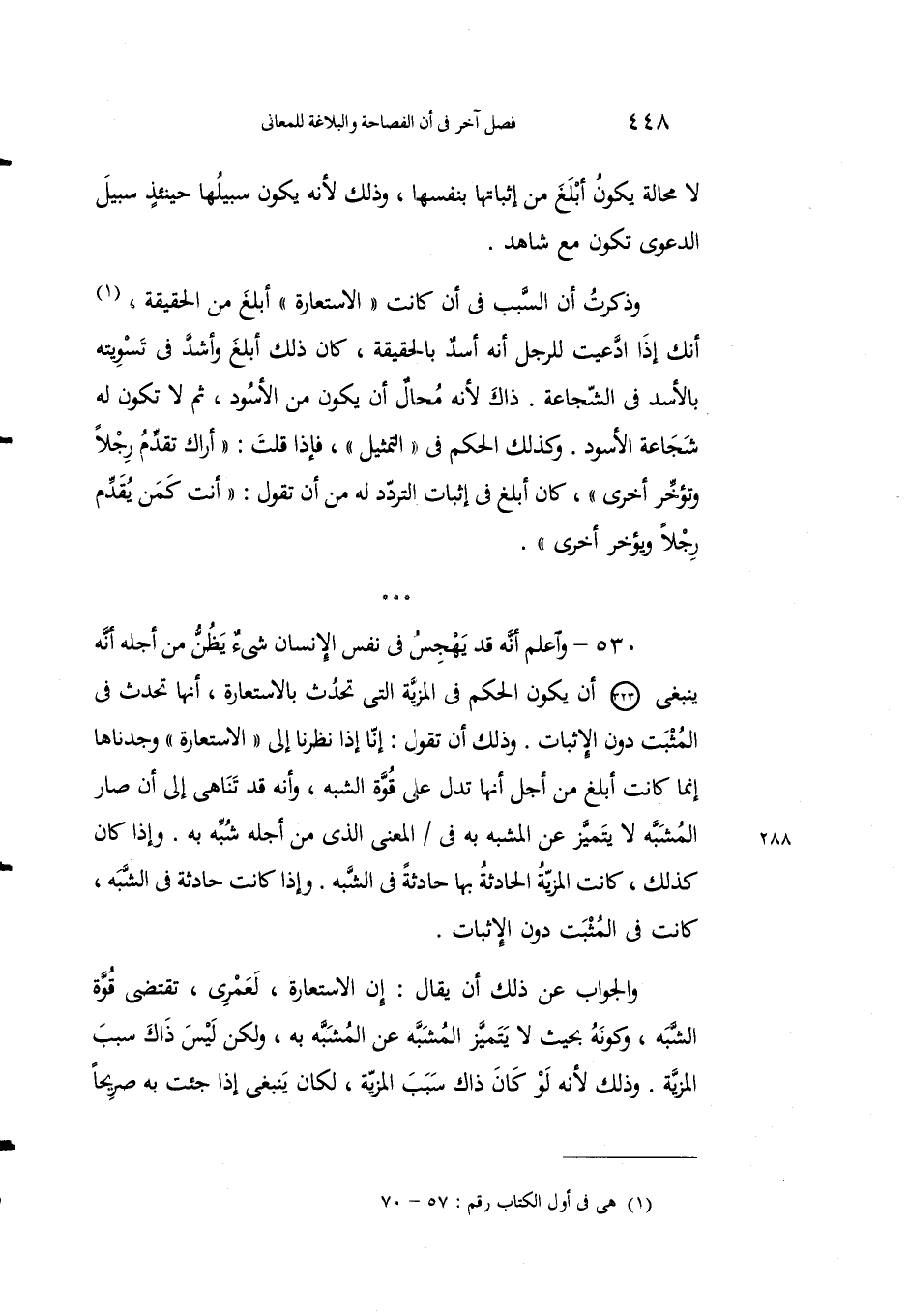 530 - واعلمْ أنه قد يَهْجُسُ في نفسِ الإِنسان شيءٌ يظنُّ مِن أجْله أنه يَنبغي أنْ يكونَ الحُكْمُ في المزيَّة التي تحدُثُ بالاستعارةِ، أنها تَحْدُثُ في المُثْبَت دون الإثباتِ. وذلك أن تقول: إنَّا إِذا نظَرْنا إلى "الاستعارةِ" وجدناها إنما كانت أبلغَ من أجلِ أنها تدلُّ على قوَّةِ الشَّبه، وأنه قد تَناهَى إلى أنْ صارَ المشبَّه لا يتميَّزُ عن المشبَّهِ بهِ في المعنى الذي من أجلهِ شُبِّهَ به. وإذا كان كذلكَ، كانت المزيةُ الحادِثةُ بها حادثةً في الشَّبه. وإِذا كانتْ حادِثَةً في الشَبَه، كانت في المُثْبَت دونَ الإثباتِ.