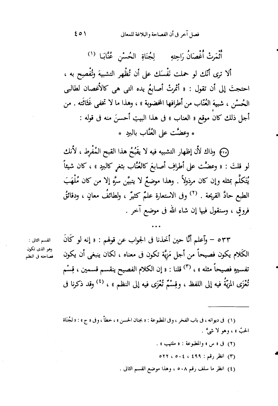 533 - واعلمْ أنَّا حينَ أخذْنا في الجوابِ عن قولِهم: "إنَّه لو كان الكلامُ يكونُ فصيحاً مِن أجْل مزيَّةٍ تكونُ في معناه، لكانَ ينبغي أن يكونَ تفسيرُه فصيحاً مثلَه"3، قلْنا: "أَنَّ الكلامَ الفصيحَ ينقسمُ قسمين، قسمٌ تُعزى المزيةُ فيه إلى اللفظِ، وقسمٌ تُعْزى فيه إلى النظم"4، وقد ذكرنا في