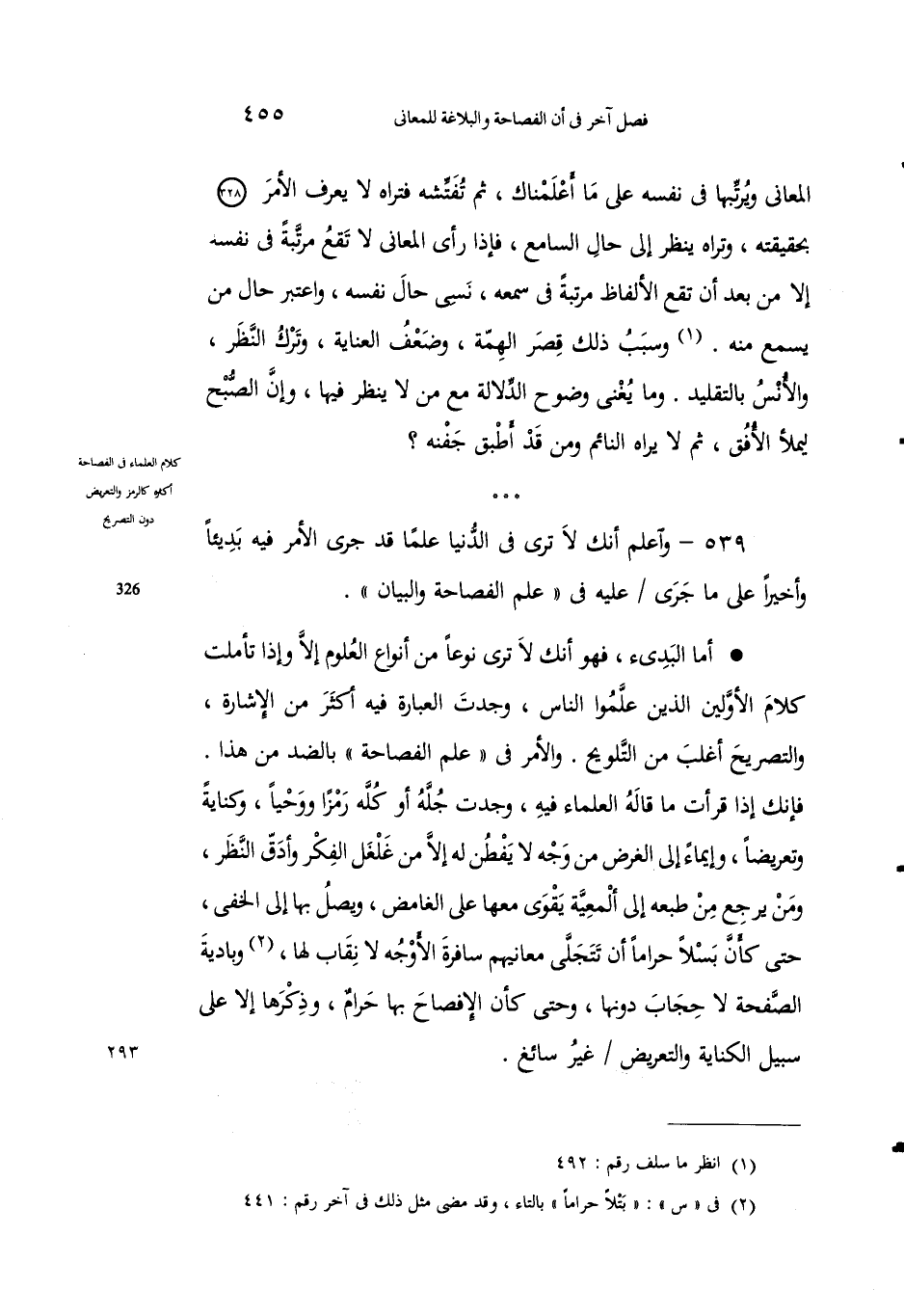 اما البدئ، فهو أنَّك لا تَرى نوعاً من أنواع العلوم إلا وإذا تأملت كلام الأولين الذي عَلَّموا الناسَ، وجدْتَ العبارةَ فيه أكثرَ من الإِشارة، والتصريحَ أغلبَ من التلويج. والأمرُ في "علمِ الفصاحةِ" بالضِّدِّ مِن هذا.