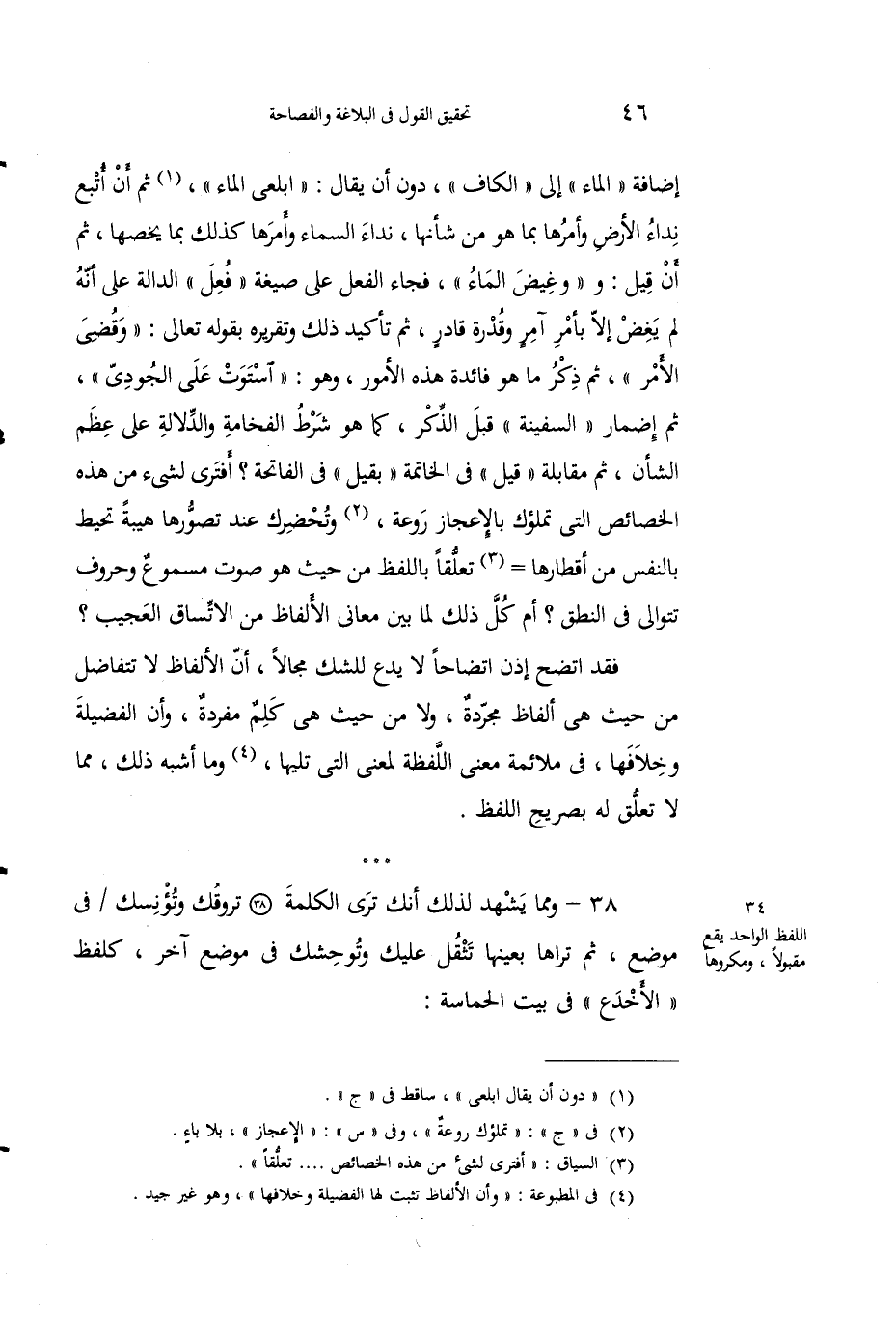 38 - وممَّا يَشهد لذلك أَنَّك تَرى الكلمةَ تروقُك وتُؤنسك في موضعٍ، ثم تَراها بعينِها تَثْقُلُ عليكَ وتُوحِشُك في موضعٍ آخرَ، كلفظِ "الأَخدع" في بيت الحماسة: