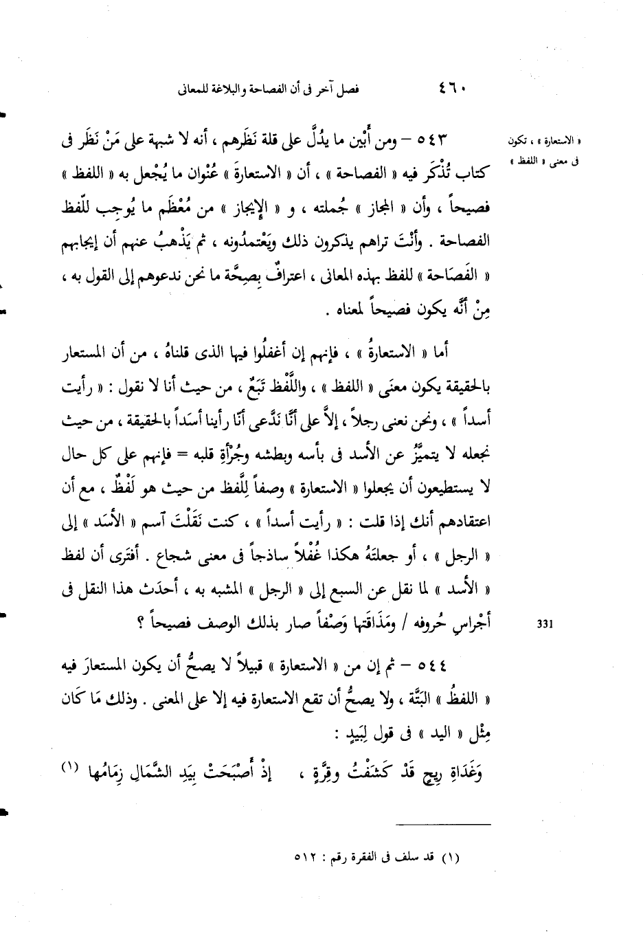 543 - ومن أَبْيَن ما يَدلُّ على قلةِ نَظَرِهم، أَنه لا شبْهةَ على مَن نَظَر في كتابٍ تُذْكَر فيه "الفصاحةُ"، أنَّ "الاستعارةَ" عنوانُ ما يُجْعَلُ به "اللفظُ" فصيحاً، وأن "المجازَ" جملته، و "الإيجاز" مِن مُعْظم ما يُوجِبُ لِلََّفظِ الفصاحةَ. وأنتَ تراهم يذكرون ذلك يعتمدونه، ثم يَذْهَبُ عنهم أنَّ إيجابَهم "الفصاحةَ" لِلَّفْظِ بهذه المعاني، اعترافٌ بصحةِ ما نحن نَدْعوهم إلى القولِ به، من أَنه يكونَ فصيحاً لمعناه.