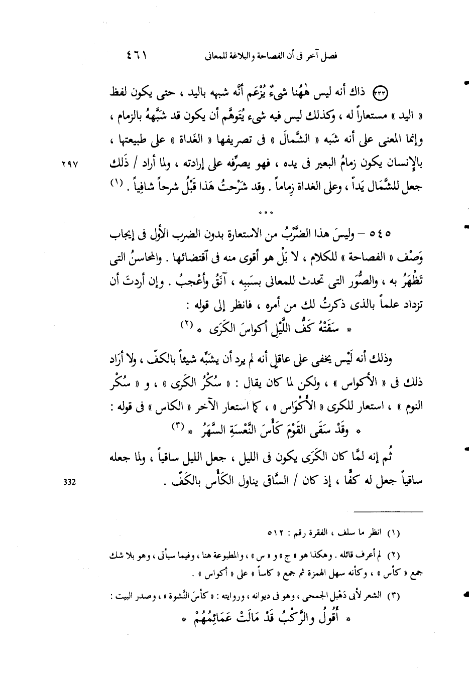 545 - وليس هذا الضربُ من الاستعارة بدُون الضربِ الأولِ في إيجابِ وصْفِ "الفصاحةِ" للكلام، لا بَلْ هو أَقوى منه فيِ اقتضائها. والمَحاسِنُ التي تَظهرُ به، والصورُ التي تَحْدثُ للمعاني بسببه، آنقُ وأعجبُ. وإنْ أردتَ أن تَزْداد عِلماً بالذي ذكرتُ لكَ من أمرِهِ، فانظرْ إلى قوله: