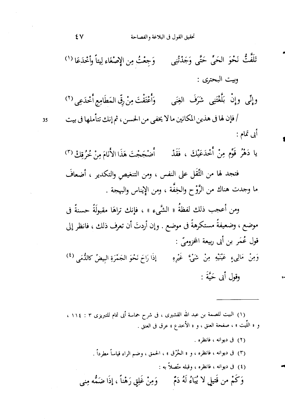 فإنَّ لها في هذين المكانَين ما لا يَخْفى مِن الحُسْن، ثم إنّكَ تتأَمُّلها في بيت أبي تمام: