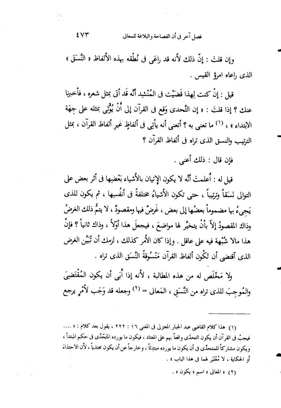 1 هذا كلام القاضي عبد الجبار المعتزلي في المغني 16: 222، يقول بعد كلام: " ... فيجب في القرآن أن يكون التحدي واقعًا بهم على المعتاد، فيكون ما يورده المتحدي في حكم المتبدأ، ويكون مشاركًا للمتحدي في أن يكون ما يورده مبتدئًا، وخارجًا عن أن يكون محتذيًا، لأن الاحتذاء أو الحكاية، لا معتبر لها في هذا الباب".