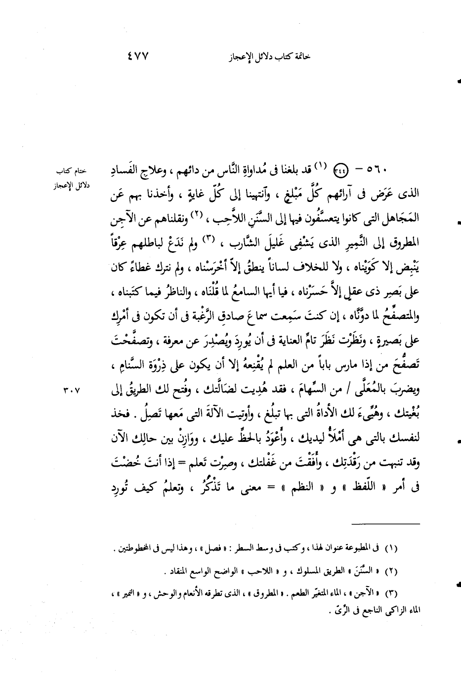 560 - قد1 بلغنا في مداواة الناسِ مِنْ دائهم، وعلاجِ الفسادِ الذي عرضَ في آرائِهم كلَّ مبلغَ، وانتهينا إلى كلِّ غاية، وأخذنا بهم عَنِ المجاهل التي كانوا يتعسَّفون فيها إلى السَّنن اللاَّحِب2، ونقلْنَاهم عَنِ الآجنِ المطروقِ إلى النَّمير الذي يَشْفي غليلَ الشارِب3، ولم ندعْ لباطِلِهم عِرْقاً ينبضُ إلاَّ كويناهُ، ولا للخلافِ لساناً ينطقُ إلاَّ أخرَسْناه، ولم نتركْ غِطاءً كان على بصَرِ ذي عَقْلٍ إلا حَسرْناهُ، فيا أيُّها السامعُ لِمَا قلناهُ، والناظرُ فيما كتبناهُ، والمتصفِّحُ لما دوَّنَّاهُ، إنْ كنتَ سمعتَ سماعَ صادقِ الرغبةِ في أن تكونَ في أَمركَ على بصيرةٍ، ونظرتَ نظَرَ تامِّ العنايةِ في أن يُورِدَ ويَصْدُرَ عن معرفةٍ، وتصفَّحْتَ تصفُّحَ مَن إذا مارَسَ باباً من العلم لم يقنعْه إلا أن يكونَ على ذِروة السَّنام، ويضرب بالمعن من السَّهام، فقد هُديتَ لضالَّتك، وفتح لك الطريقُ إلى بُغْيتك، وهُيِّئ لك الأداةُ التي بها تبلغُ، وأُوتيت الآلةَ التي معها تصل. فخذْ لنفسكَ بالتي هي أملًا ليديك، وأعوذ بالحظِّ عليكَ، ووازنْ بين حالِك الآن وقد تنبَّهْتَ من رَقْدتك، وأفقْتَ من غفْلتك، وصرتَ تعلمُ إِذا أنتَ خُضتَ في أمر "اللفظ" و "النظم" معنى ما تذكر، وتعلم كيف نورد
