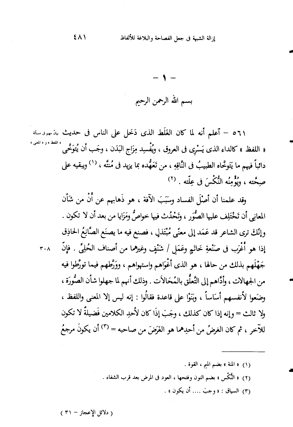وقد علِمْنا أنَّ أصْل الفسادِ وسبَبَ الآفةِ، هو ذَهابهُم عن أنَّ مِن شأنِ المعاني أن تَختلِفَ عليها الصورُ، وتَحدُثَ فيها خواص وموايا من بعد أن لا تكون. وإنك ترَى الشاعرَ قد عَمدَ إلى معنىً مبتذَلٍ، فصنَعَ فيه ما يَصْنَعُ الصانِعُ الحاذِقُ إذا هو أغرب ي صَنْعة خاتمٍ وعَمَلِ شَنْفٍ وغيرهما من أصناف الحِلى. فإنَّ جهْلَهم بذلك من حالِها، هو الذي أغواهم واستهواهم، وورطهم يما توَرَّطوا فيه من الجهَالات، وأَدَّاهُم إلى التعلُّق بالمُحالات. وذلك أَنهم لمَّا جَهِلوا شأنَ الصورةِ، وضَعُوا لأَنفُسِهم أساساً، وبنَوْا على قاعدة فقالوا: إنه ليسَ إِلاّ المعنى واللفظُ، ولا ثالثَ وإنه إذا كان كذلكَ، وجَبَ إذا كان لأحدِ الكلامَيْنِ فضيلةٌ لا تَكون للآخَر، ثم كان الغرَضُ مِنْ أحدِهما هوَ الغَرَضَ من صاحبه3 أن يكون مرجع