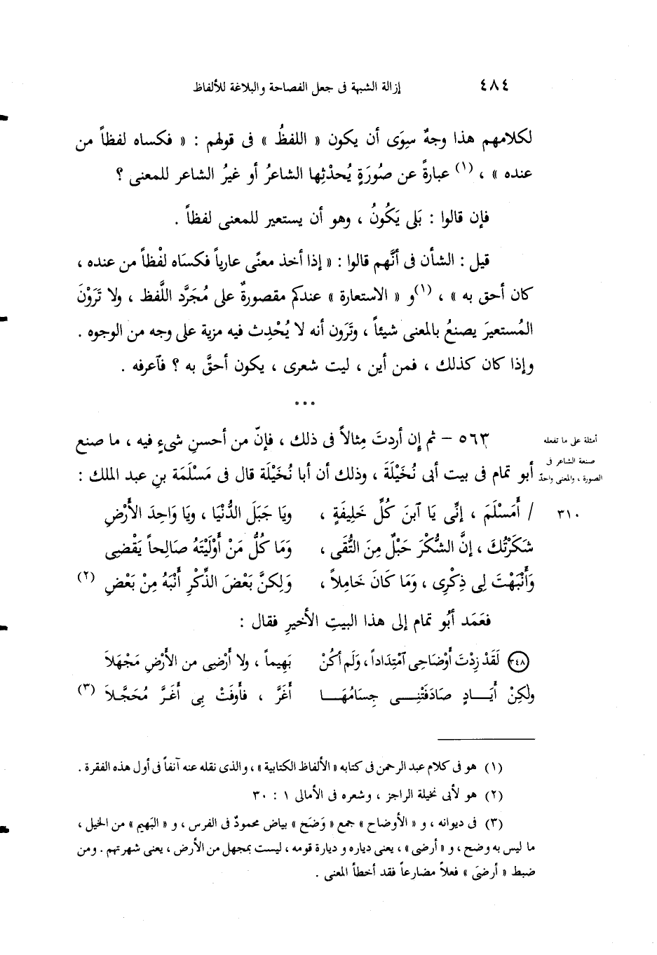 563 - ثُمَّ إنْ أردْتَ مثالاً في ذلك، فإنَّ من أحسن شيء فيه، ما صمع أبو تمام في بيتِ أَبي نُخَيْلة، وذلك أن أَبا نُخيلةَ قال في مسلمَةَ بنِ عبد الملك: