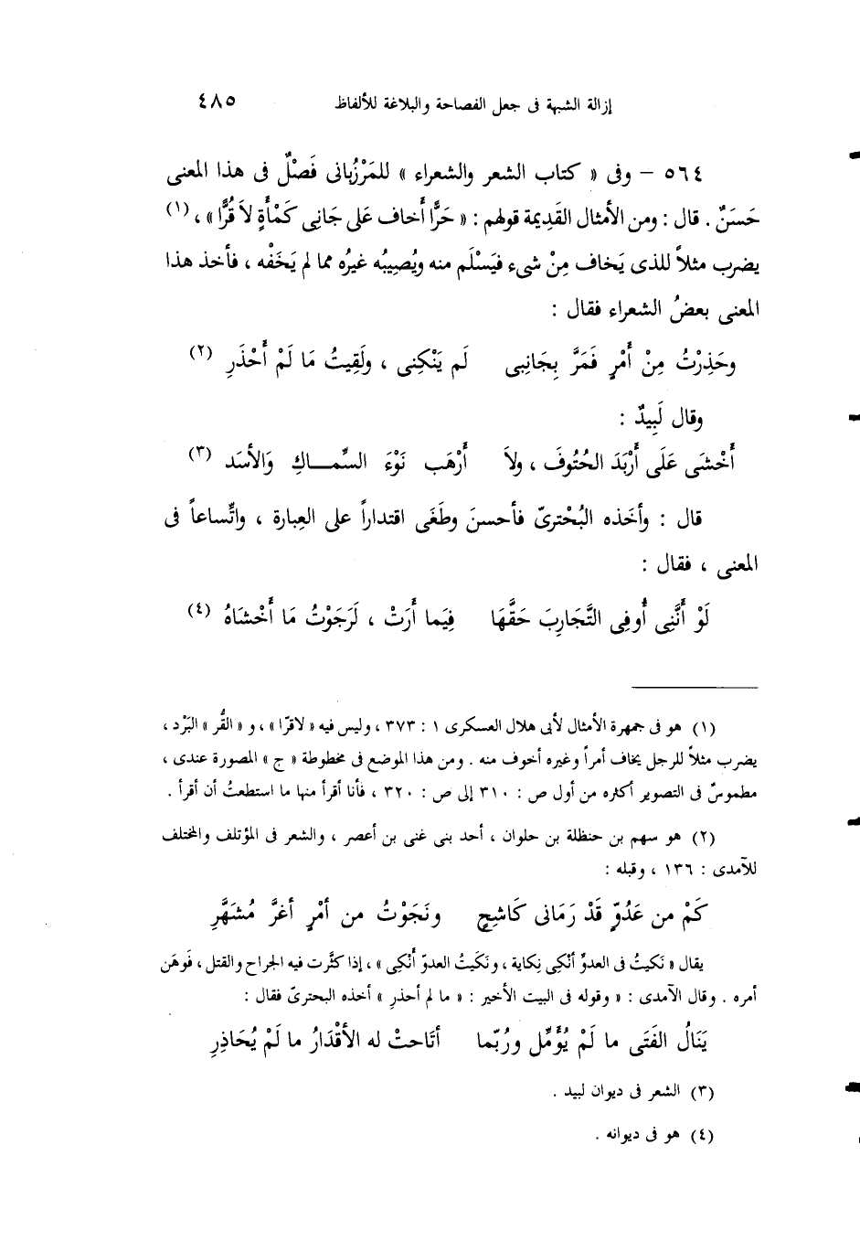 564 - وفي "كتاب الشّعرِ والشُّعراء" للمرزُباني فصلٌ في هذا المعنى حسَنٌ. قال. ومن الأَمثال القديمة قولهُم: "حَرًّا أخافُ على جاني كَمأَةٍ لا قُرّاً"1، يُضرَب مثَلاً للذي يَخافُ مِن شيءٍ فيَسْلمُ منهُ ويُصِيبهُ غيرهُ مما لم يَخَفْهُ، فأخذ هذا المعنى بعض الشعراء فقال: