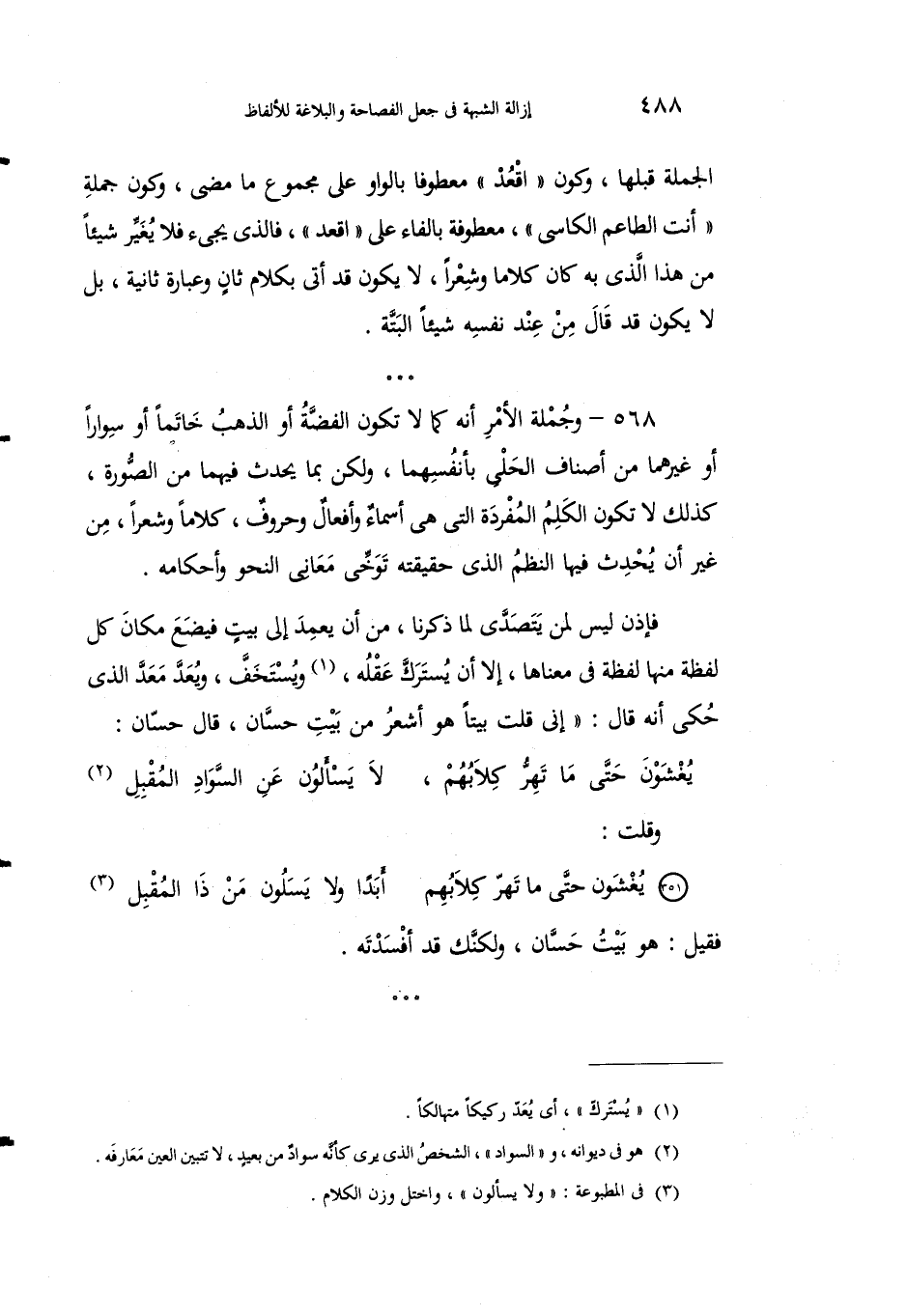568 - وجملةُ الأمر أَنه كما لا تكون الفِضّةُ أو الذَهَب خاتماً أو سِواراً أو غيرَهُما من أصناف الحِلَى بأنفُسِهما، ولكنْ بما يحدُثُ فيهما من الصُّورة، كذلك لا تكونُ الكَلِمُ المفردةُ التي هي أسماءٌ وأفعالٌ وحروفٌ، كلاماً وشعراً، من غير أن يحدُثَ فيها النظْمُ الذي حقيقَتُه توَخِّي معاني النحو وأَحكامِه.