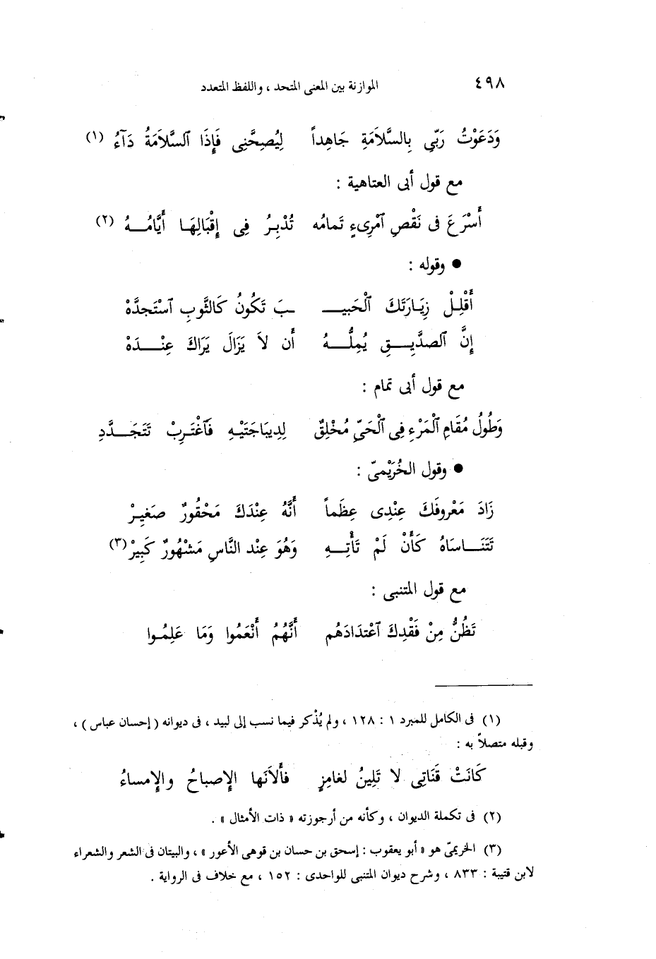 3 الخريمي هو "أبو يعقوب": إسحق بن حسان بن قوهي الأعور"، والبيتان في الشعر والشعراء لابن قتيبة: 833، وشرح ديوان المتنبي للواحدي: 152، مع خلاف في الرواية.