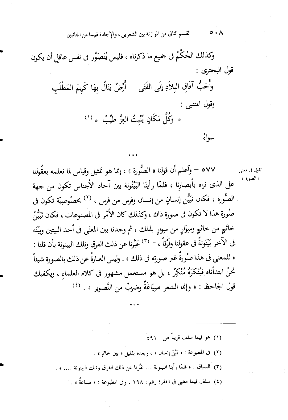 577 - واعلمْ أنَّ قولَنا "الصورةُ"، إِنما هو تمثيلٌ وقياسٌ لما نَعْلَمه بعقولنا على الذي نرَاه بأبصارنا، فلما رأَينْا البَيْنونة بين آحادِ الأجناسِ تكونُ مِنْ جِهةَ الصورةِ، فكان تبين إنسانٍ مِنْ أنسانٍ وفرَسٍ من فرسٍ2، بخصوصيةٍ تكونُ في صورةِ هذا لا تكونُ في صورةِ ذاك، وكذلك كان الأمرُ في المصنوعاتِ، فكانَ تَبَيُّنُ خاتَمٍ من خاتمٍ وسِوَارٍ من سِوَارٍ بذلك، ثم وجَدْنا بينَ المعنى في أحد البيتين وبينه في الآخر بينونةً في عقولِنا وفَرْقاً3، عَبَّرْنا عن ذلك الفرقِ وتلكَ البينونةِ بأَنْ قلْنا: "لِلمعنى فيِ هذا صورةٌ غيرُ صورتهِ في ذلك". وليس العبارة من ذلك بالصورةِ شيئاً نحن ابتدأناه فيُنْكِرَهُ مُنْكِرٌ، بل هو مُستعمَلُ مشهورٌ في كلام العلماءِ، ويكفيك قول الجاحظ: "وإنما الشعر صياغة وضرب من التصوير"4.