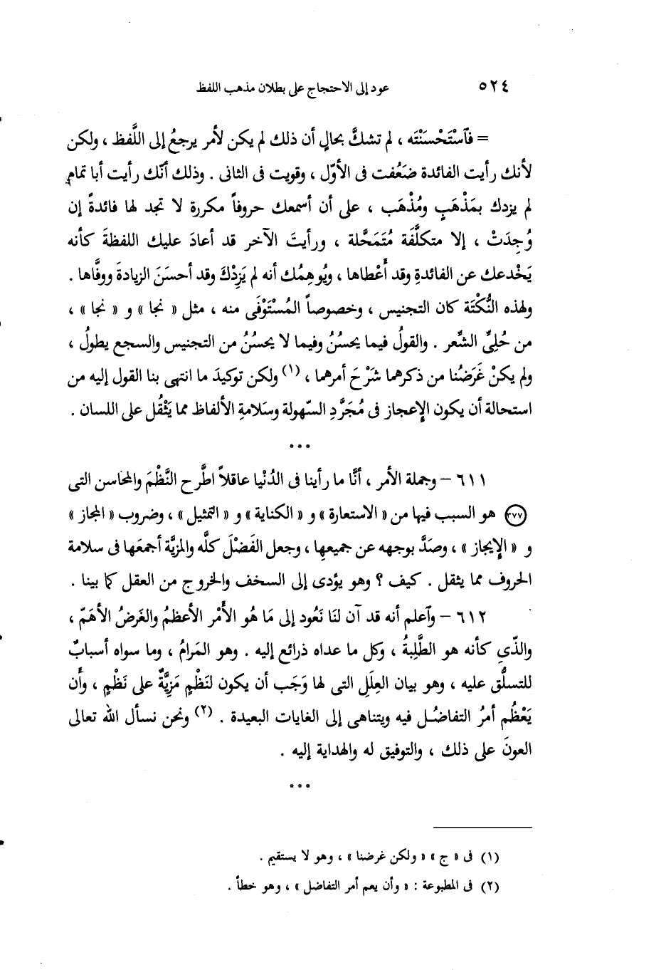 612 - واعلمْ أنه قد آنَ لنا نعودَ إِلى ما هو الأمْرُ الأعظَمُ والغَرضُ الأهَمُ، والذي كأنه هو الطَّلِبة، وكلُّ ما عَداهُ ذرائعُ إِليه. وهو المَرامُ، وما سواهُ أسبابٌ للتسلُّق عليه، وهو بيانُ العِلل التي لها وَجَبَ أن يكونَ لِنظْمٍ مزيةٌ على نظم، وأن يعظم أمر التفاضل فيه وتيناهى إِلى الغاياتِ البعيدةِ2. ونحنُ نسألُ الله تعالى العون على ذلك، والتوفيق له والهداية له.