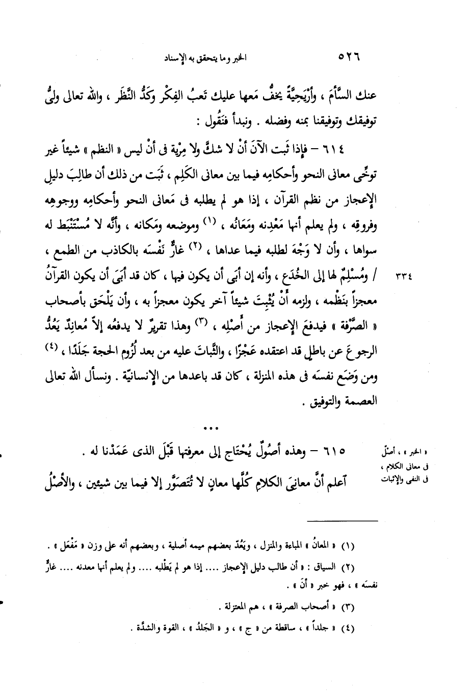 614 - فإِذا ثبتَ الآن أنْ لا شَكَّ ولا مِرْيَةَ في أنْ ليسَ "النظمُ" شيئاً غيرَ توخِّي معاني النحو وأحكامه فيما بين معاني الكلم، ثبتَ من ذلك أنَّ طالبَ دليلِ الإِعجازِ مِنْ نَظْمِ القرآنِ، إِذا هو لم يطلبْهُ في معاني النحو وأحكامه ووجوه وفروقِه، ولم يَعْلمْ أنها مَعْدنِه ومَعانُه1، وموضعه ومكانُه، وأنه لا مُستنبَط له سِواها، وأنْ لا وجْهَ لطلبهِ فيما عداها2، غارٌّ نفْسَه بالكاذِب من الطَمَع، ومُسْلمٌ لها إِلى الخُدَع، وأنهُ إِنْ أبى أن يكونَ فيها، كان قد أبى أنْ يكون القرآنُ معجزاً بنظمه، ولزمه أن يُثبت شيئاً آخر يكون معجزًابه، وأنْ يلحقَ بأصحابِ "الصَّرفة" فيدفعَ الإِعجازَ من أصلِه3، وهذا تقريرٌ لا يدفعه إِلا مُعانِدٌ يَعُدّ الرجوعَ عن باطلٍ قد اعتقدَه عجزاً، والثَّباتَ عليه مِنْ بَعْدِ لزوم الحجَّةِ جلداً4، ومن وضعه نفسَه في هذه المنزلةِ، كان قد باعَدَها من الإِنسانية. ونسألُ الله تَعالى العصمةَ والتوفيقَ.