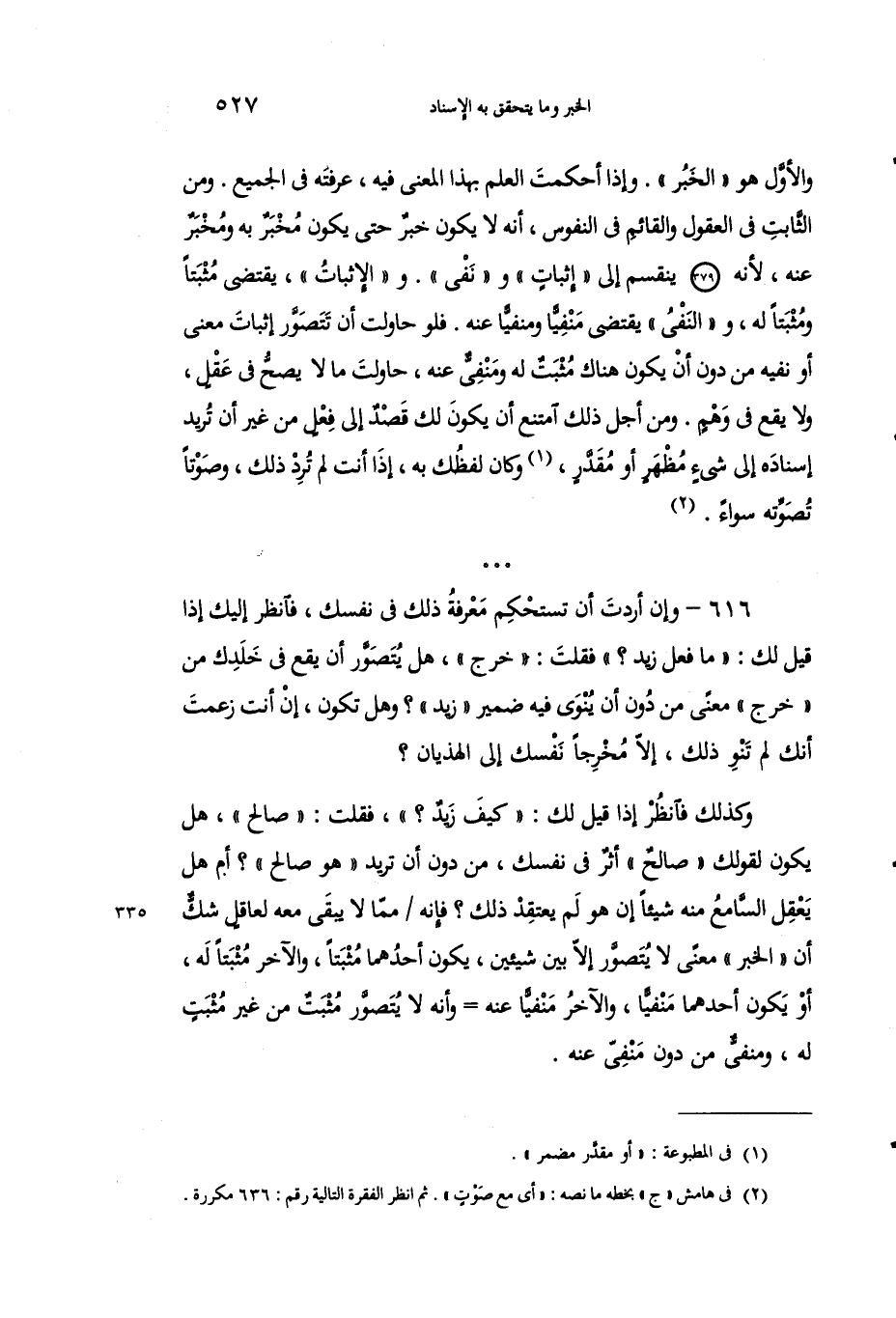 والأولُ هو "الخبر". وإِذا أحكمتَ العلم بهذا المعنى فيه، عرفتَه في الجميع. ومن الثابتِ في العقولِ والقائمِ في النفوسِ، أنه لا يكونُ خبرٌ حتى يكونَ مخبَرٌ به وَمُخبرٌ عنه، لأنه، ينقسم إلى "إثبات" و "نفي". و "الإثبات"، يقتضي مثبتًا ومثبتًاله، و "النفي" يقتضي مَنفياً ومنفياً عنه. فلو حاولتَ أنْ تتصور إثبات معنى أو نَفْيُهُ مِنْ دون أن يكونَ هناكَ مُثبتٌ له ومنفيٌّ عنه، حاولتَ ما لا يَصِحُّ في عَقْلِ، ولا يقعُ في وهم. ومن أجل ذلك امتنع أنت يكون لك قصد إلى فعل من غير أن تريد إسناده إلى شيء مظهر او مقدر1، وكان لفظُكَ به، إِذا أنتَ لم تُرِدْ ذلك، وصوتًا توصته سواء2.