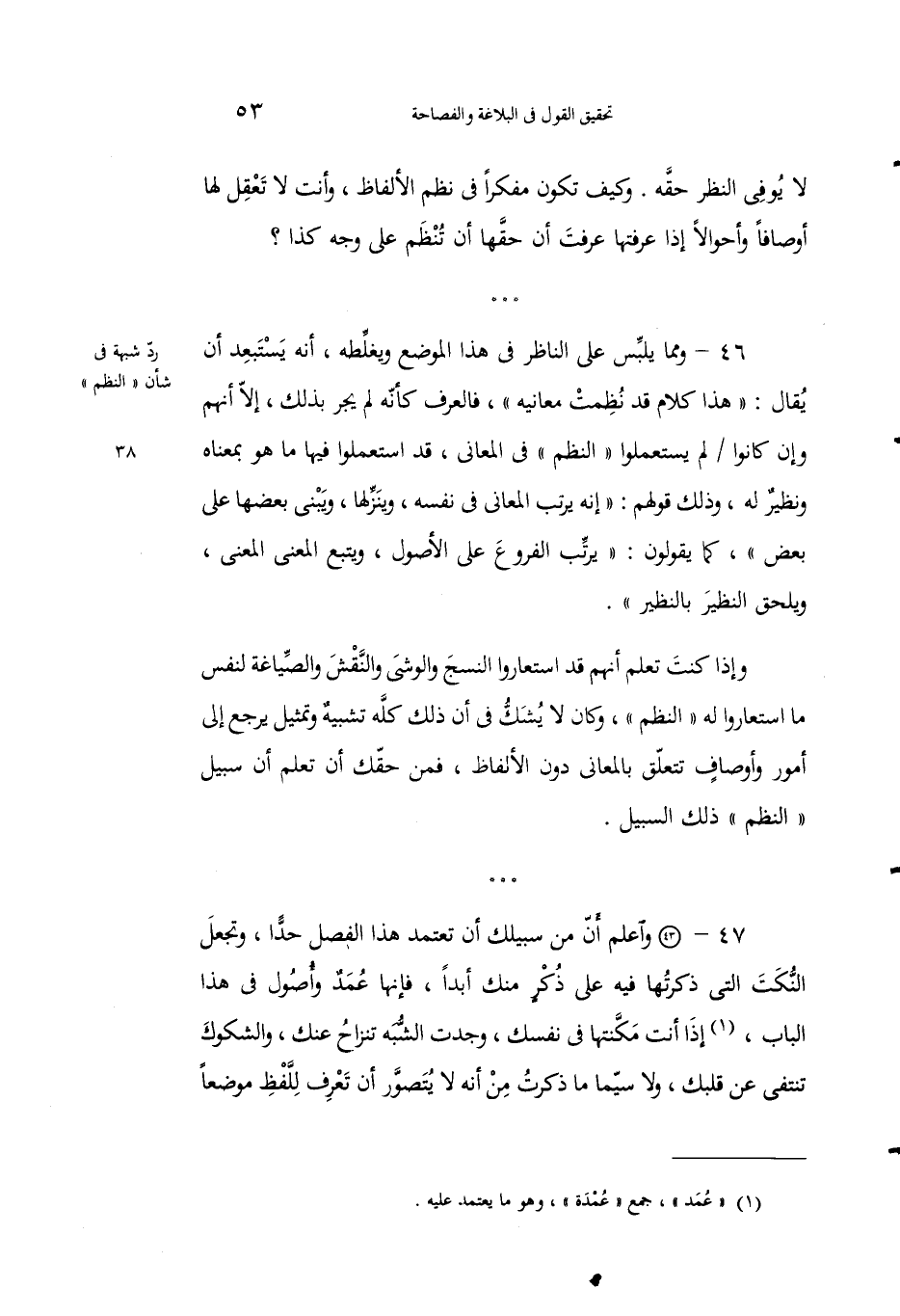 47 - واعلمْ أنَّ مِنْ سبيلك أن تَعتمِدَ هذا الفصْلَ حَدّاً، وتَجْعل النُّكَتَ التي ذكرتُها فيه على ذُكْرٍ منكَ أبداً، فإِنها عَمَدٌ وأُصولٌ في هذا الباب1، إذا أنت مكَّنْتَها في نَفْسك، وجدْتَ الشُّبَه تنزاحُ عنك، والشكوكَ تَنْتفي عن قَلبك، ولا سيَّما ما ذكرتُ من أنه لا يُتَصوَّر أنْ تَعرِفَ للفظ موضعًا