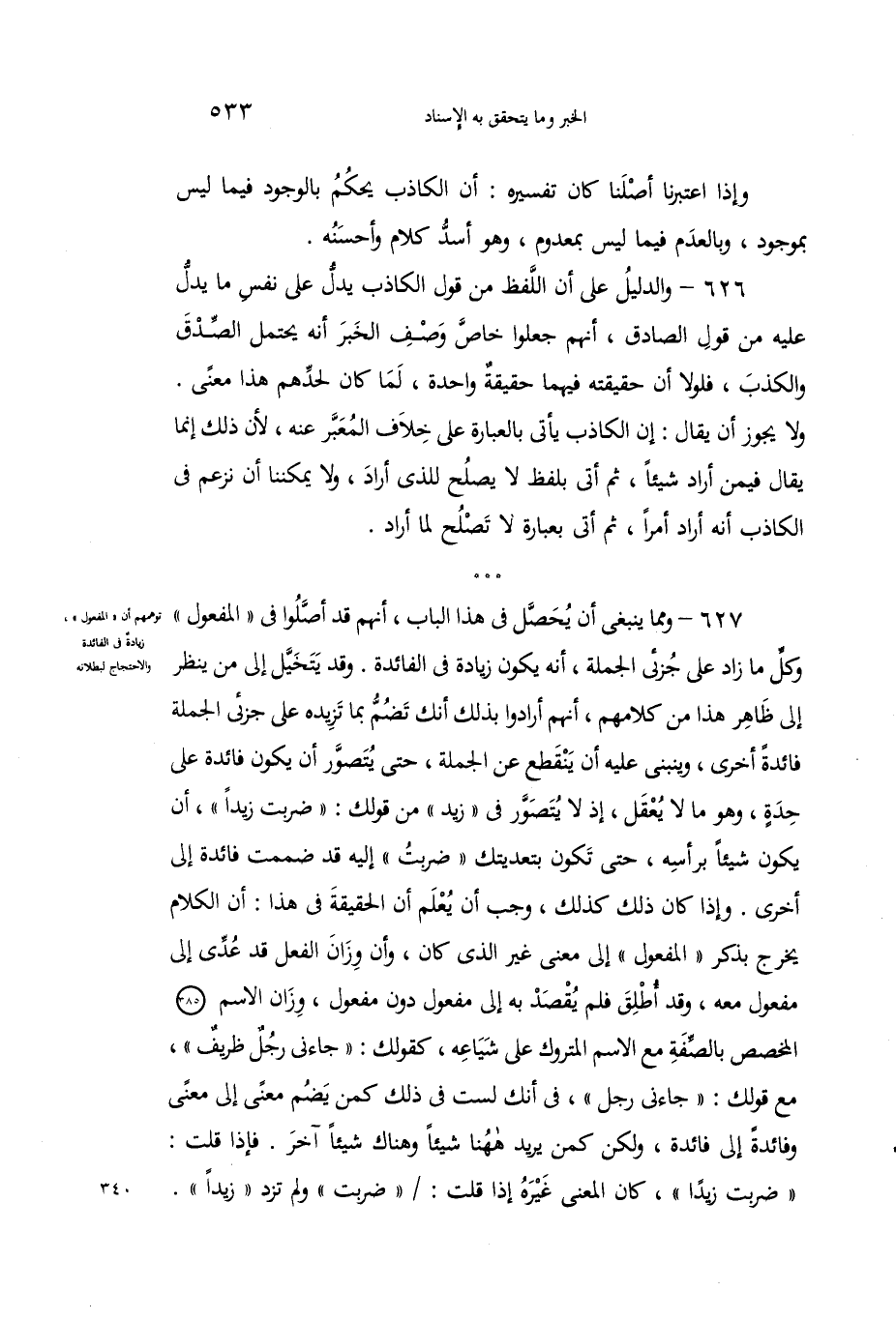 626 - والدليلُ على أن اللفظَ من قولِ الكاذب يدلُّ على نفس ما يدل عليه من قولِ الصادق، إنهم جعلوا خاصَّ وصفِ الخبر أنه يحتَمِل الصدقَ والكَذِبَ، فلولا أنَّ حقيقتَهُ فيهما حقيقةٌ واحدةُ، لما كانَ لحدِّهم هذا معنى، ولا يجوزُ أن يقالَ: إِن الكاذبَ يأتي بالعبارةِ على خلافِ المعبَّر عنه لأن ذلك إِنما يقال فيمن أرادَ شيئاً، ثم أتى بلفظ لا يصح للذي أراد، ولا يمكننا أن نزعمَ في الكاذب أنه أرادَ أمراً، ثم أتى بعبارةٍ لا تصلح لما أراد.