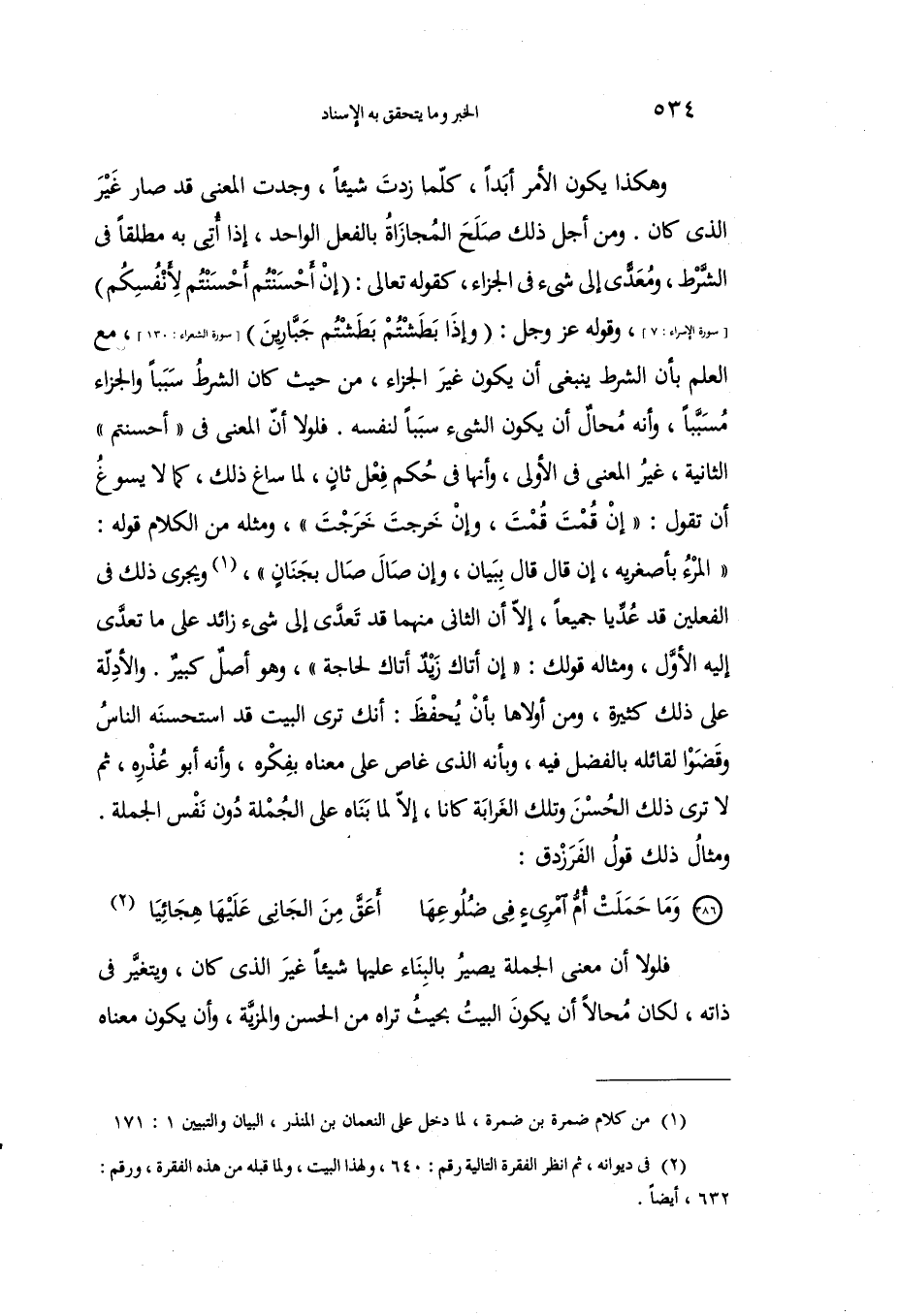 وهكذا يكون الأمرُ أبداً، كلَما زدتَ شيئاً، وجدتَ المعنى قد صارَ غير الذي كان. ومن أجلِ ذلكَ صَلُح المجازاةُ بالفعل الواحد، إذا أتى به مطلقًا في الشطر، ومعدى إلى شيء في الجزاء، كقوله تعالى: {إِنْ أَحْسَنْتُمْ أَحْسَنْتُمْ لَأَنْفُسِكُمْ} [الإسراء: 7]، وقولِه عزَّ وجل: {وَإِذَا بَطَشْتُمْ بَطَشْتُمْ جَبَّارِين} [الشعراء: 130]، مع العلم بأن الشرطَ ينبغي أن يكونَ غيرَ الجزاء، من حيثُ كان الشرطُ سبباً والجزاءُ مسبِّباً، وأنه محال أن يكونَ الشيء سبباً لنفسِه. فلولا أن المعنى في "أحسنتُم" الثانية، غيرُ المعنى في الأولى، وأَنها في حكيم فعلٍ ثانٍ، لما سَاغ ذلك، كما لا يسوغ أن تقول: "إنْ قمتُ قمتَ، وإن خرجتُ خرجتَ"، ومثلُه من الكلام قولُه: "المرءُ بأصغريه، أن قال قال بيان، وإن صالَ صالَ بجَنانٍ"1، ويجري ذلك في الفعلين قد عُدِّيا جميعاً، إلا أن الثاني منهما قد تعدى إلى شيء زاد على ما تعدَّى إليه الأول، ومثالهُ قولُك: "إن أتاك زيدٌ أتاك لحاجة"، وهو أصلٌ كبير. والأدلةُ على ذلك كثيرة، ومن أولاها بأن يحفظ: أنك ترى البيتَ قد استحسنه الناسُ وقَضَوا لقائله بالفضلِ فيه، وبأنَه الذي غاصَ على معناه بفكره، وأنه أبو عُذْره، ثم لا ترى ذلك الحسنَ وتلك الغرابة كانا، إلا لِما بناهُ على الجملةِ دونَ نفسِ الجملةِ. ومثالُ ذلك قول الفرزدق: