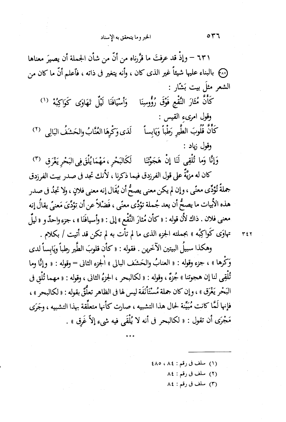631 - وإِذ قد عرفتَ ما قررناه من أنَّ من شأنِ الجملة أن يصير معناها بالبناء عليها شيئاً غيرَ الذي كان، وأنه يتغيِّر في ذاته، فاعلم أن ما كان من الشعر مثل بيت بشار:
