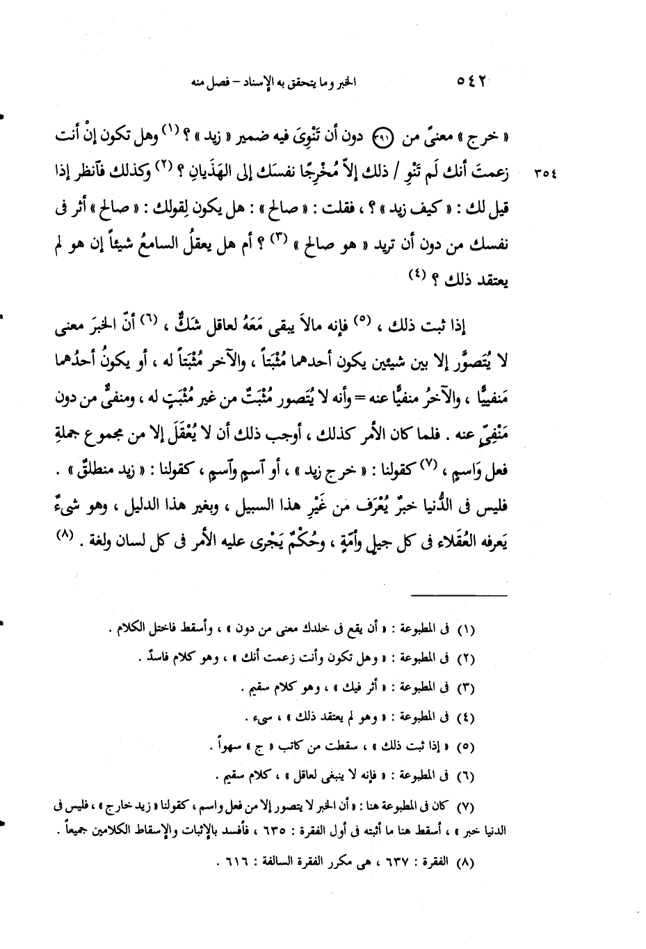7 كان في المطبوعة هنا: "أن الخبر لا يتصور إلا من فعل واسم، كقولنا "زيد خارج"، فليس في الدنيا خير"، أسقط هنا ما أثبته في أول الفقرة: 635، فأفسد بالإثبات والإسقاط الكلامين جميعًا.