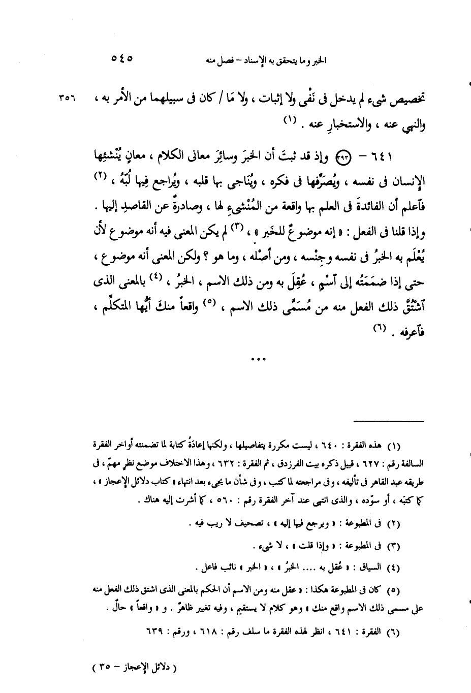 1 هذه الفقرة: 640، ليست مكررة يتفاصليها، ولكنها إعادة كتابة لما تضمنته أواخر الفقرة السالفة رقم: 627، قبيل ذكره بيت الفرزدق، ثم الفقرة: 632، وهذا الاختلاف موضع نظر مهم، في طريقة عبد القاهر في تأليفه، وفي مراجعته لما كتب، وفي شأن ما يجيء بعد انتهاء "كتاب دلائل الإعجاز"، كما كتبه، أو سوده، والذي انتهى عند آخر الفقرة رقم: 560، كما أشرت إليه هناك.