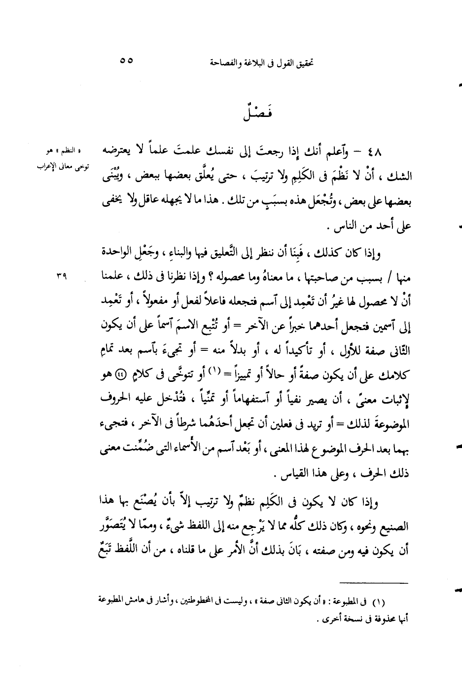 48 - واعلمْ أَنك إِذا رجعتَ إلى نفسِك علمتَ علْماً لا يعترضُه الشكُّ، أنْ لا نَظْمَ في الكَلِم ولا ترتيبَ، حتى يُعلَّقَ بعضُها ببعضٍ، وَيْبني بعضُها على بَعض، وتُجعلَ هذه بسبب من تلك. هذا ما لا يَجهلُه عاقلٌ ولا يخْفَى على أحدٍ منَ الناس.