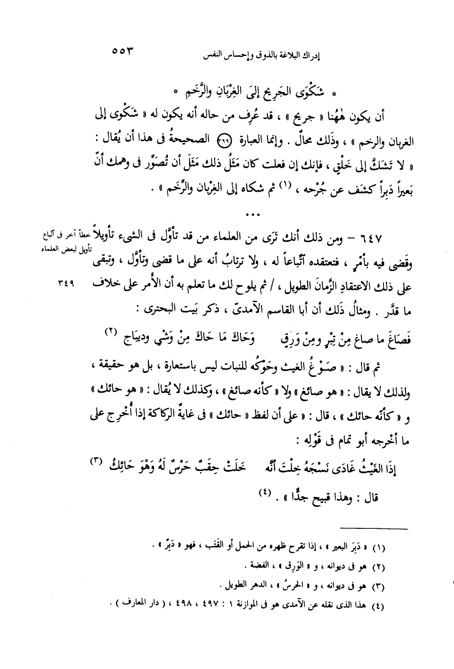 647 - ومن ذلك تَرى من العلماءِ مَن قد تأوَّلَ في الشيء تأويلاً وقَضى فيه بأمرٍ، فتَعْتَقِدُه اتِّباعاً له، ولا تَرتابُ أنه على ما قَضى وتأوَّلَ، وتَبْقى على ذلك الاعتقادِ الزمانَ الطويلَ، ثم يلوحُ لك ما تعلَم به أنَّ الأمرَ على خِلاف ما قَدَّرَ. ومثالُ ذلك أنَّ أبا القاسم الآمديَّ، ذكَر بيتَ البحتريِّ:
