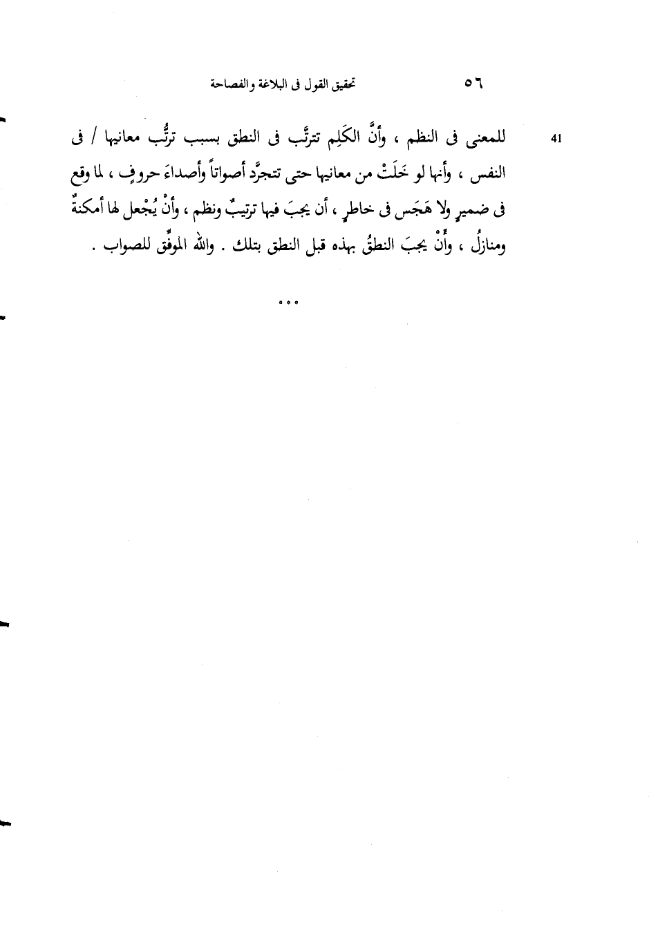 للمعنى في النظْم، وأنَّ الكلمَ تَترتَّب في النُّطقِ بسببِ تَرتُّبِ معانيها في النَّفس، وأنها لَوْ خَلَتْ من مَعانيها حتى تَتجرَّد أصواتاً وأصداءَ حروفٍ، لما وقعَ في ضميرٍ ولا هَجَس في خاطرٍ، أن يَجب فيها ترتيبٌ ونَظْم، وأن يُجْعَل لها أمكنةٌ ومنازِلُ، وأنْ يجبَ النطقُ بهذه قَبْل النطقِ بتلك. واللهُ الموفق للصواب.