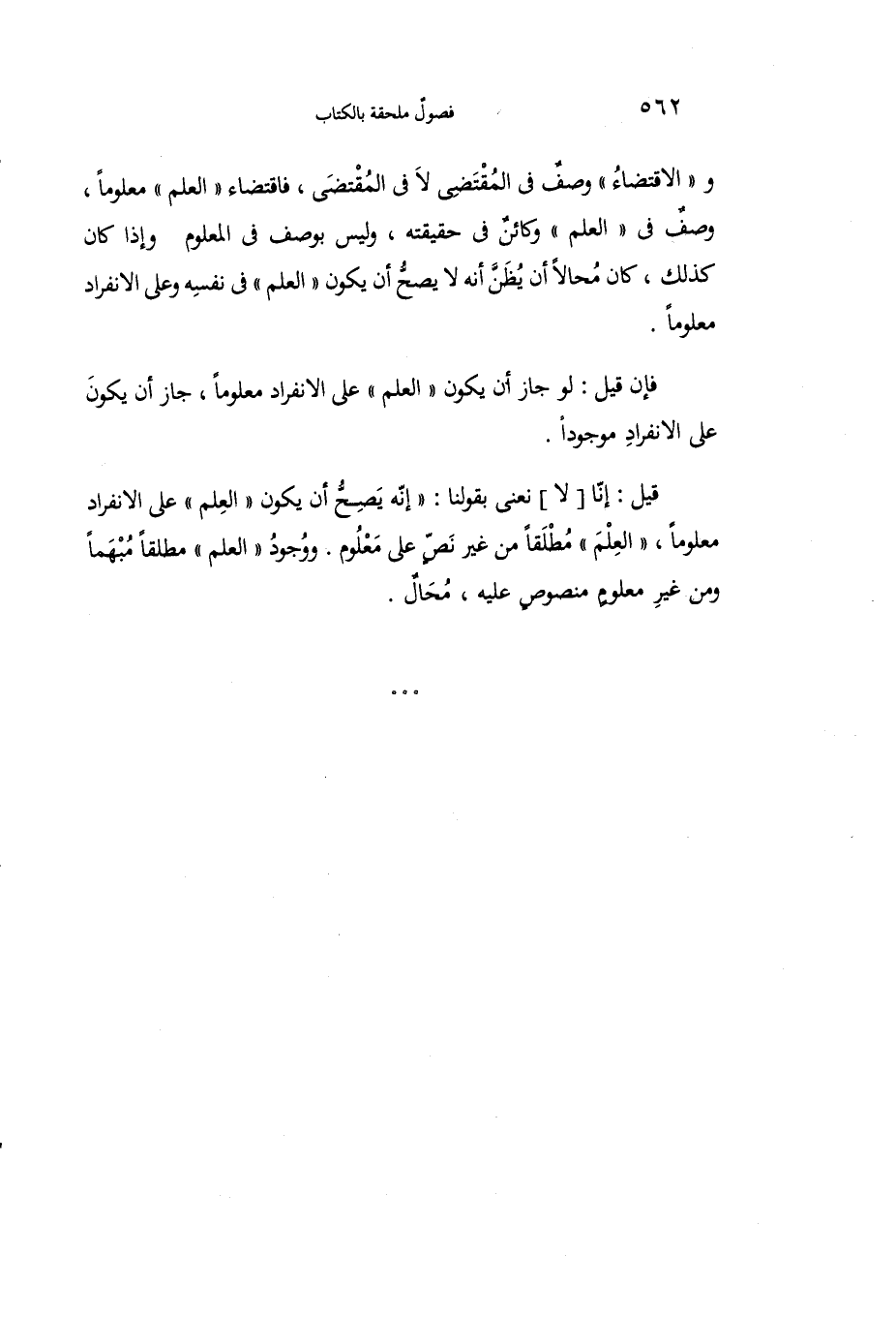 قيل: إنا [لا] نعني بقولنا: "إنه يصح أن يكون "العلم" على الانفراد معلومًا، "العلم" مطلقًا من غير نص على معلوم. ووجود "العلم" مطلقًا مبهمًا ومن غير معلوم منصوص عليه، محال.