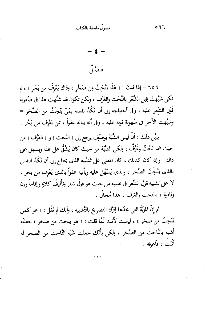 565 - إذا قلت: "هذا ينحت من صخر، وذاك يعرف من بحر"، لم تكن شبهت قيل الشعر بالنحت والغرف، لكن تكون قد شبهت هذا في صعوبة قول الشعر عليه، وفي آحتياجه إلى أن يكد نفسه بمن ينحت من الصخر وشبهت الآخر في سهولة قوله عليه، وفي أنه يناله عفوًا، بمن يعرف من بحر.