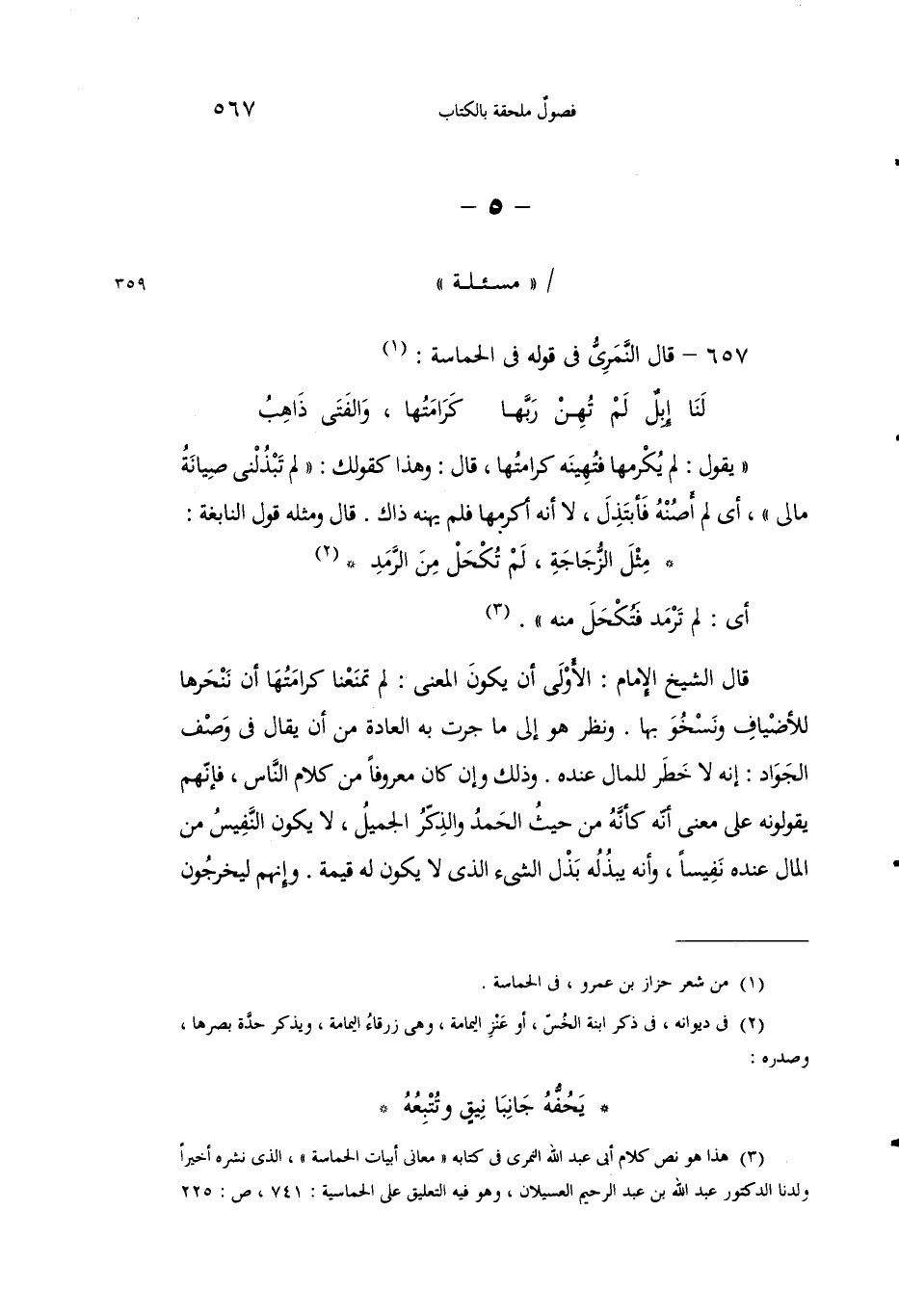 3 هذا هو نص كلام أبي عبد الله النمرى في كتابه "معاني أبيات الحماسة"، الذي نشره أخيرًا ولدنا الدكتور عبد الله بن عبد الرحيم العسيلان، وهو فيه التعليق على الحماسية: 741، ص: 225.