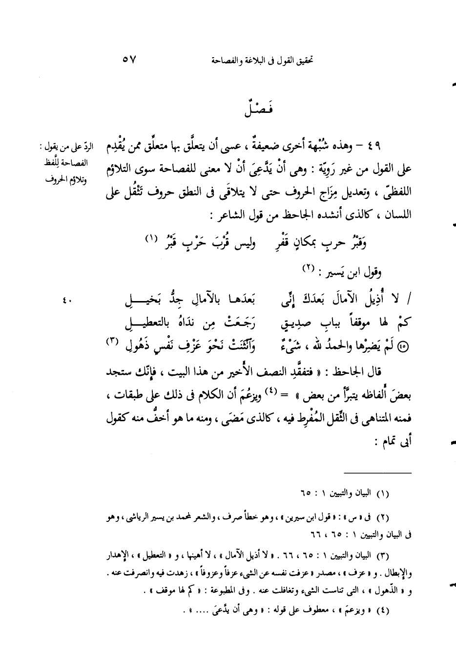 49 - وهذه شُبهةٌ أُخرى ضعيفةٌ، عسى أن يتعلَّقَ بها مُتعلِّقٌ ممَّن يُقْدم على القولِ من غيرِ رويّةٍ: وهي أنْ يَدَّعي أنْ لا معنى للفصاحة سِوى التلاؤمِ اللَّفظيّ، وتعديلِ مِزَاجِ الحُروفِ حتى لا يتلاقى في النُّطقِ حروفٌ تَثْقلُ على اللسَان، كالذي أنَشْدَه الجاحظ من قول الشاعر: