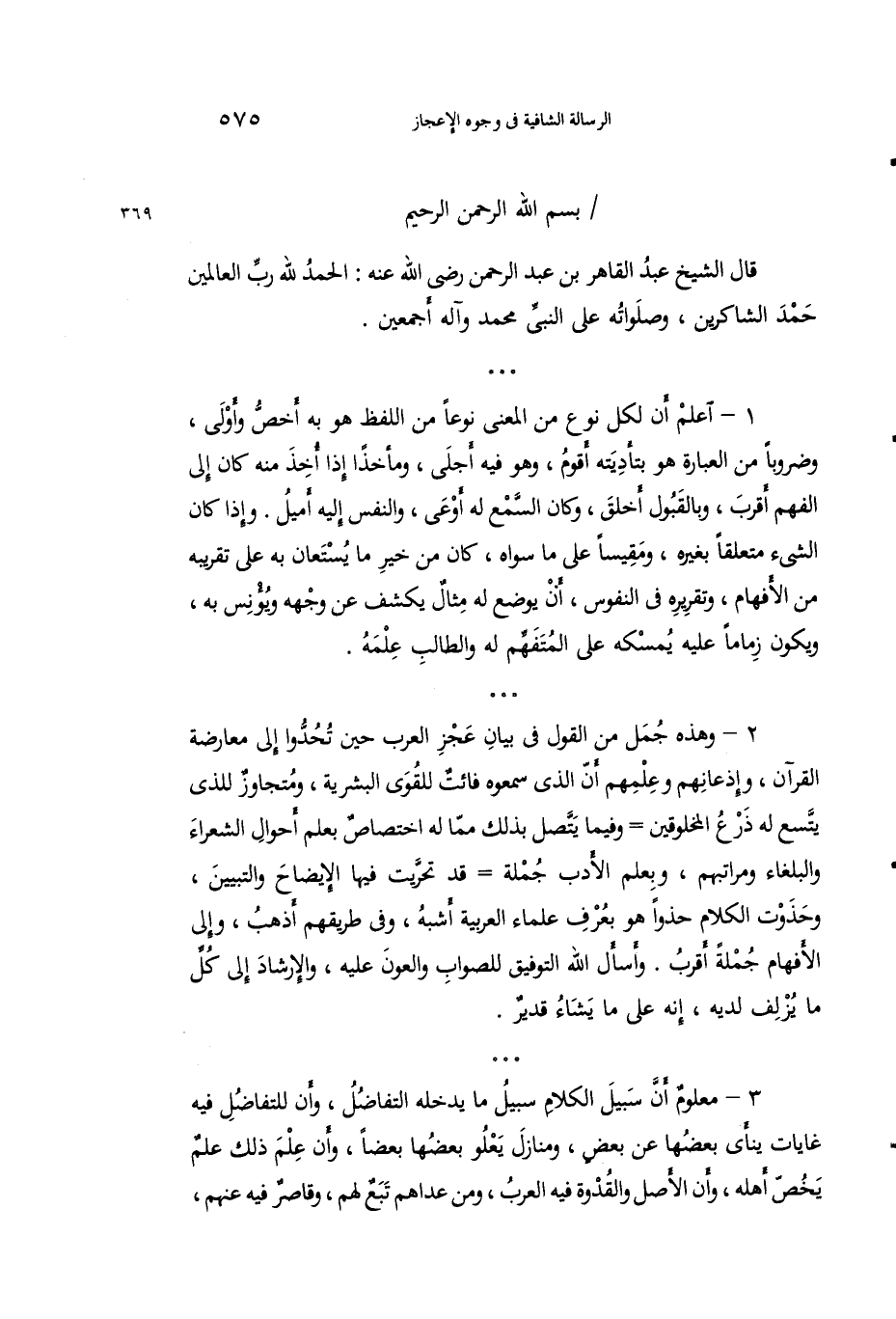 2 - وهذه جمل من القول في بيان عجز العرب حين تحدوا إلى معارضة القرآن، وإذعانهم وعلمهم أن الذي سمعوه فائتٌ للقوى البشرية، ومتجاوزٌ للذي يتَّسع له ذرع المخلوقين وفيما يتصل بذلك مما له اختصاص بعلم أحوال الشعراء والبلغاء ومراتبهم، وبعلم الأدب جملة قد تحريت فيه االإيضاح والتبيين، وحذوت الكلام حذوًا هو بعرف علماء العربية أشبه، وفي طريقهم أذهب، وإلى الأفهام جملة أقرب. وأسأل الله التوفيق للصواب والعون عليه، والإرشاد إلى كل ما يزلف لديه، إنه على ما يشاء قدير.