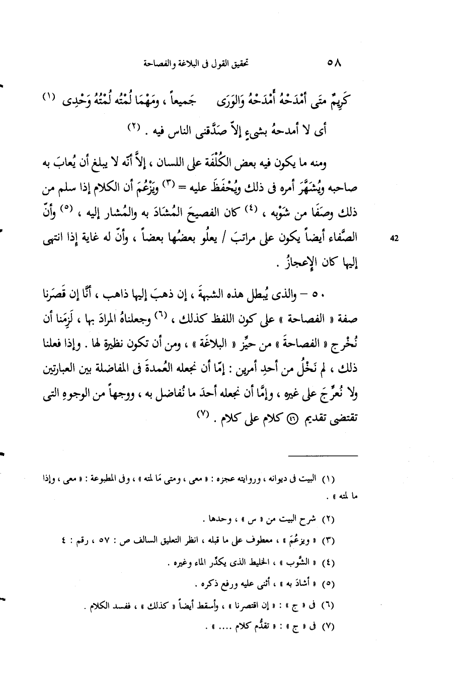 ومنه ما يكونُ فيه بعضُ الكُلْفة على اللسان، إلاَّ أَنه لا يَبلغُ أن يُعابَ به صاحبه ويشهر أمره في ذلك ويفحظ عليه3 ويزعمُ أن الكلامَ إذا سَلمَ من ذلك وصفَا من شَوْبِه4، كان الفصيحَ المشادَ به والمُشارَ إليه5، وأنَّ الصفاءَ أيضاً يكونُ على مراتبَ يعلو بعضُها بعْضاً، وأنَّ له غايةً إذا انتهى إليها كانَ الإِعجاز.