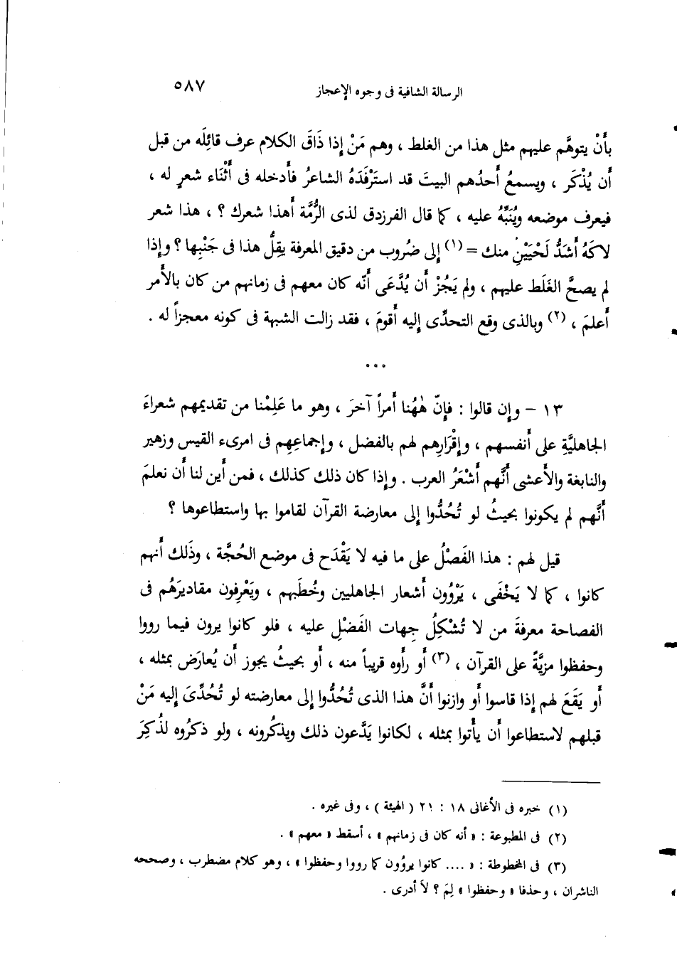 13 - وإن قالوا: فإن ههنا أمرًا آخر، وهو ما علمنا من تقديمهم شعراء الجاهلية على أنفسهم، وإقرارهم لهم بالفضل، وإجماعهم في امرئ القيس وزهير والنابغة والأعشى أنهم أشعر العرب. وإذا كان ذلك كذلك، فمن أين لنا أن نعلم أنهم لم يكونوا بحيث لو تحدوا إلى معارضة القرآن لقاموا بها واستطاعوها؟