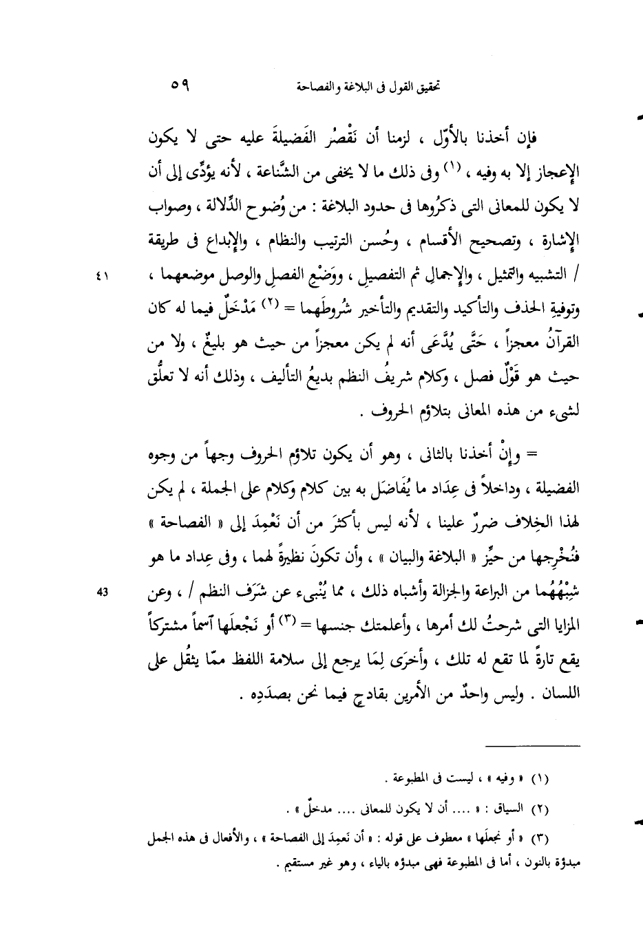 3 "أو نجعلها" معطوفة على قوله: "أن نعمد إلى الفصاحة"، والأفعال في هذا الجمل مبدؤه بالنون، أما في المطبوعة فهي مبدؤه بالياء، وهو غير مستقيم.