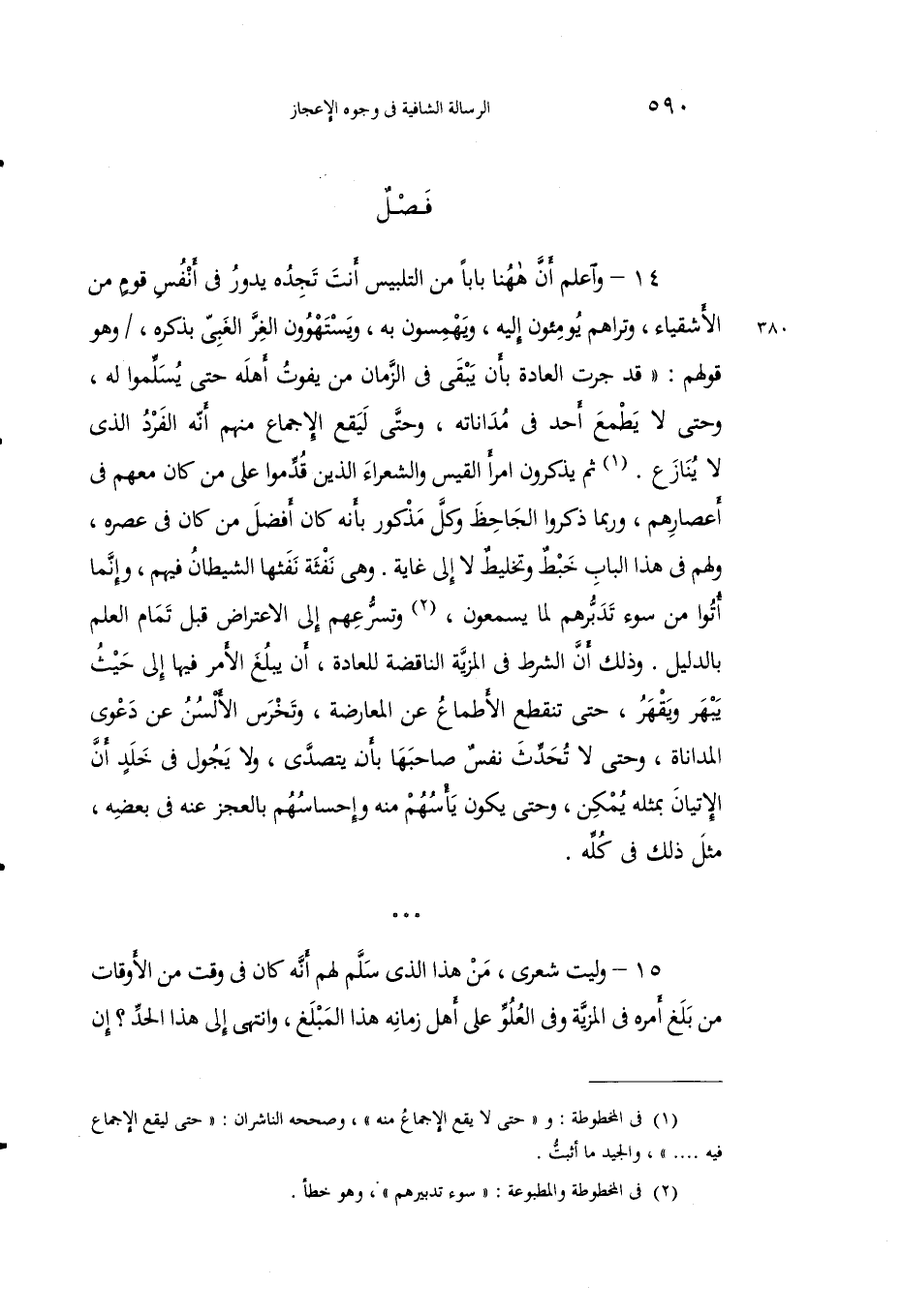 14 - واعلم أن ههنا بابًا من التلبيس أنت تجده يدور في أنس قوم من الأشقياء، وتراهم يومئون إليه، ويهمسون به، ويستهوون الغر الغبي بذكره، وهو قولهم: "قد جرت العادة بأن يبقى في الزمان من يفوت أهله حتى يسلموا له، وحتى لا يطمع أحد في مداناته، وحتى ليقع الإجماع منهم أنه الفرد الذي لا ينازع1. ثم يذكرون أمرأ القيس والشعراء الذين قدموا على من كان معهم من أعصارهم، ومما ذكروا الجاحظ وكل مذكور بأنه كان أفضل من كان في عصره، ولهم في هذا الباب خبط وتخليط لا إلى غاية. وهي نفثة نفثها الشيطان فيهم، وإنما أتوا من سوء تدبرهم لما يسمعون2، وتسرعهم إلى الاعتراض قبل تمام العلم بالدليل. وذلك أن الشرط في المزية الناقضة للعادة، أن يبلغ الأمر فيها إلى حيث المداناة، وحتى لا تحدث نفس صاحبها بأن يتصدى، ولا يجول في خلد أن الإتيان بمثله يمكن، وحتى يكون يأسهم منه وإحساسهم بالعجز عنه في بعضه، مثل ذلك في كله.