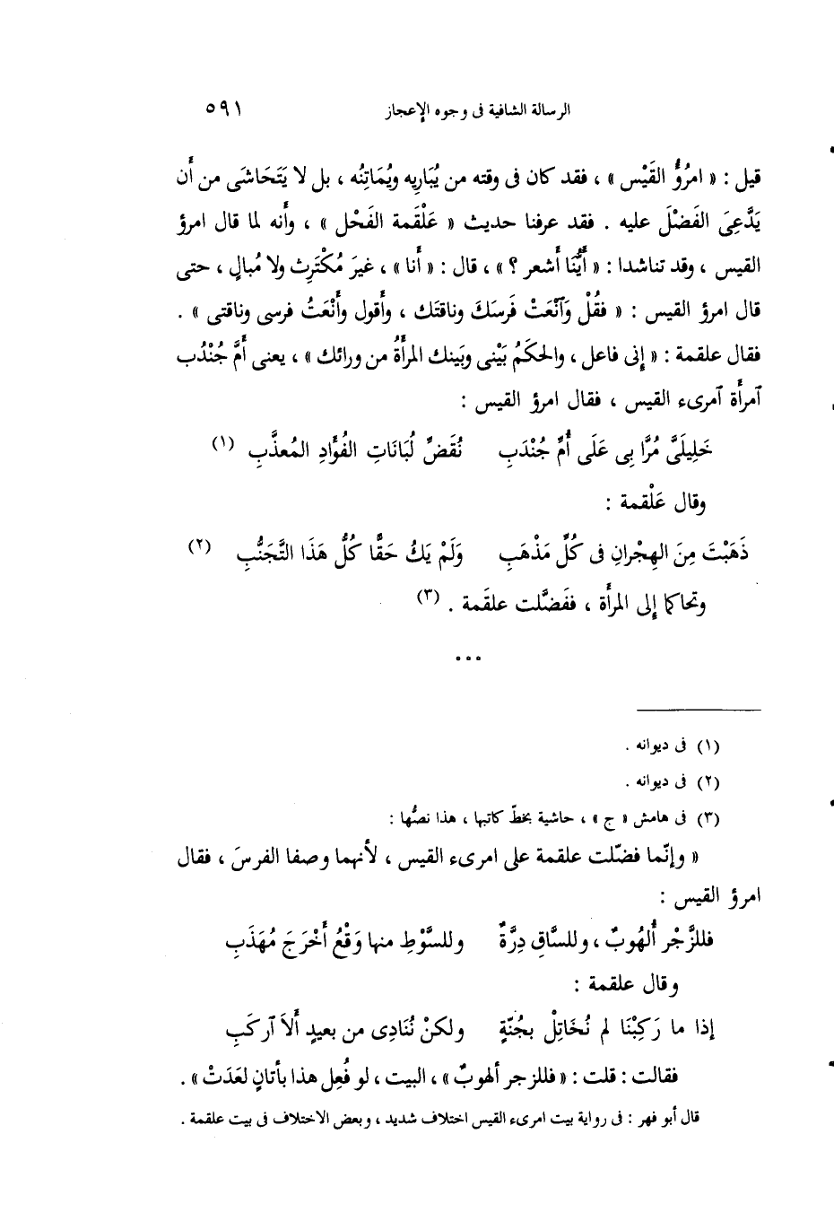 "وإنما فضلت علقمة على امرئ القيس، لأنهما وصفا الفرس، فقال امرؤ القيس: