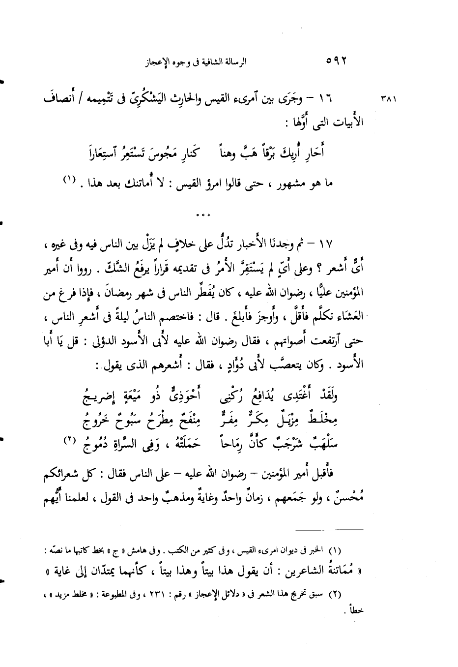 17 - ثم وجدنا الخبار تدل على خلاف لم يزم بين الناس فيه وفي غيره، أي أشعر؟ وعلى أي لم يستقر الأمر في تقديمه قرارًا برفع الشك. رووا أن أمير المؤمنين عليًا، رضوان الله عليه، كان يفطر الناس في شهر رمضان، فإذا فرغ من العشاء تكلم فأقل، وأوجز فأبلغ. قال: فاختصم الناس ليلة في أشعر الناس، حتى ارتفعت أصواتهم، فقال رضوان الله عليه لأبي الأسود الدؤلي: قل يا أبا الأسود. وكان يتعصب لأبي دؤاد، فقال: أشعرهم الذي يقول: